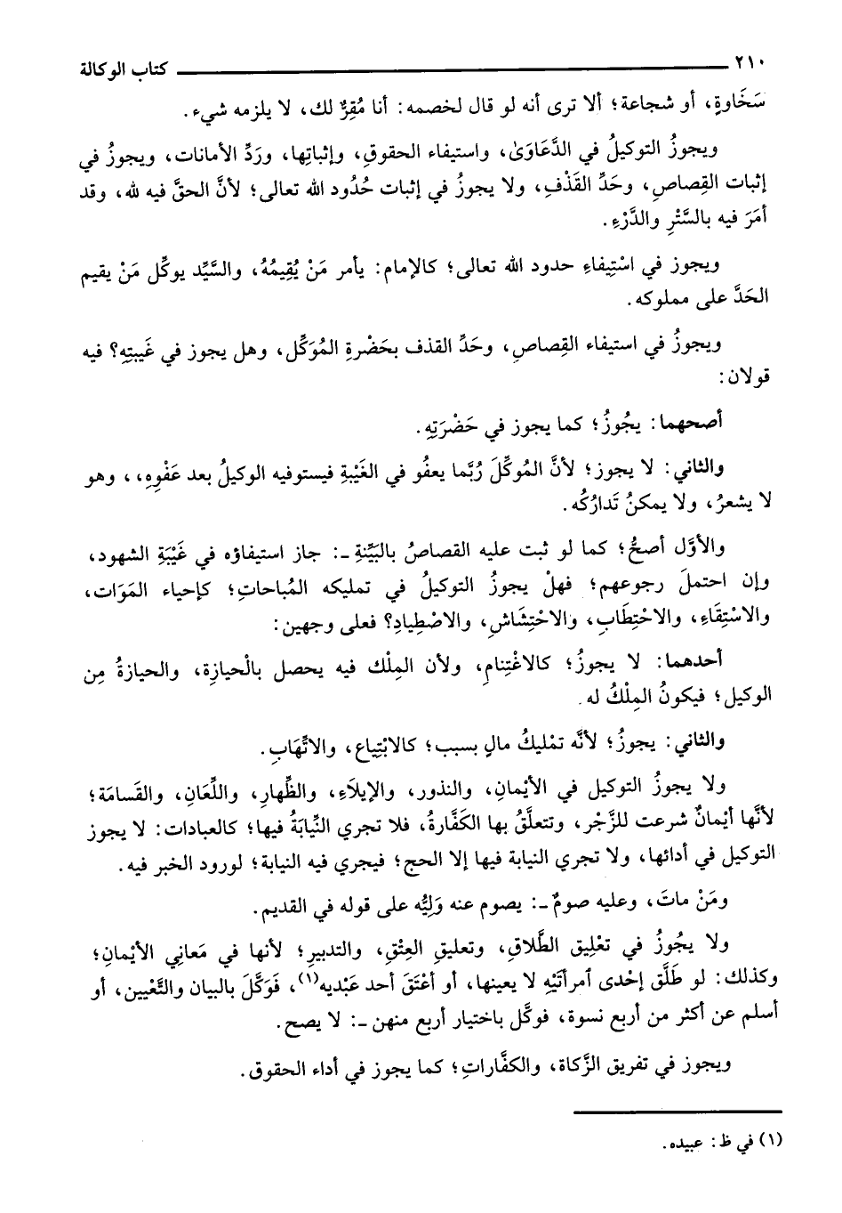 ولا يجوز التوكيل في الأيمان، والنذور، والإيلاء، والظهار، واللعان، والقسامة؛ لأنها أيمان شرعت للزجر، وتتعلق بها الكفارة، فلا تجري النيابة فيها؛ كالعبادات: لا يجوز التوكيل في أدائها، ولا تجري النيابة فيها إلا الحج؛ فيجري فيه النيابة؛ لورود الخبر فيه.