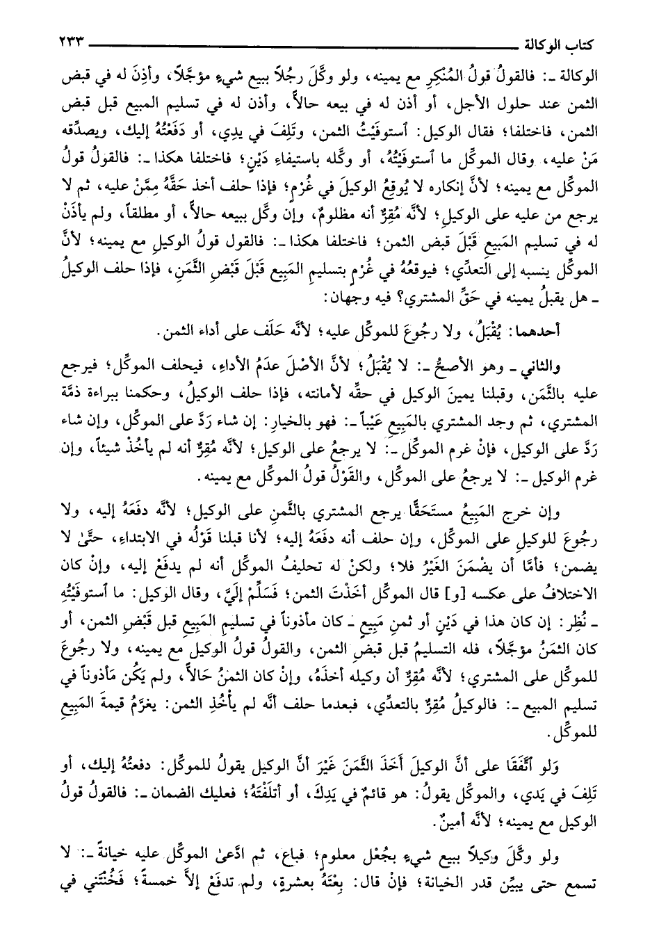 الوكالة: فالقول قول المُنكر مع يمينه، ولو وكل رجلاً ببيع شيء مؤجلاً، وأذن له في قبض الثمن عند حلول الأجل، أو أذن له في بيعه حالاً، وأذن له في تسليم المبيع قبل قبض الثمن، فاختلفا؛ فقال الوكيل: استوفيت الثمن، وتلف في يدي، أو دفعته إليك، ويصدقه من عليه، وقال الموكل ما استوفيته، أو وكله باستيفاء دين؛ فاختلفا هكذا: فالقول قول الموكل مع يمينه؛ لأن إنكاره لا يوقع الوكيل في غرم؛ فإذا حلف أخذ حقه ممن عليه، ثم لا يرجع من عليه على الوكيل؛ لأنه مقر أنه مظلوم، وإن وكل ببيعه حالاً، أو مطلقاً، ولم يأذن له في تسليم المبيع قبل قبض الثمن؛ فاختلفا هكذا: فالقول قول الوكيل مع يمينه؛ لأن الموكل ينسبه إلى التعدي؛ فيوقعه في غرم بتسليم المبيع قبل قبض الثمن، فإذا حلف الوكيل- هل يقبل يمينه في حق المشتري؟ فيه وجهان:
