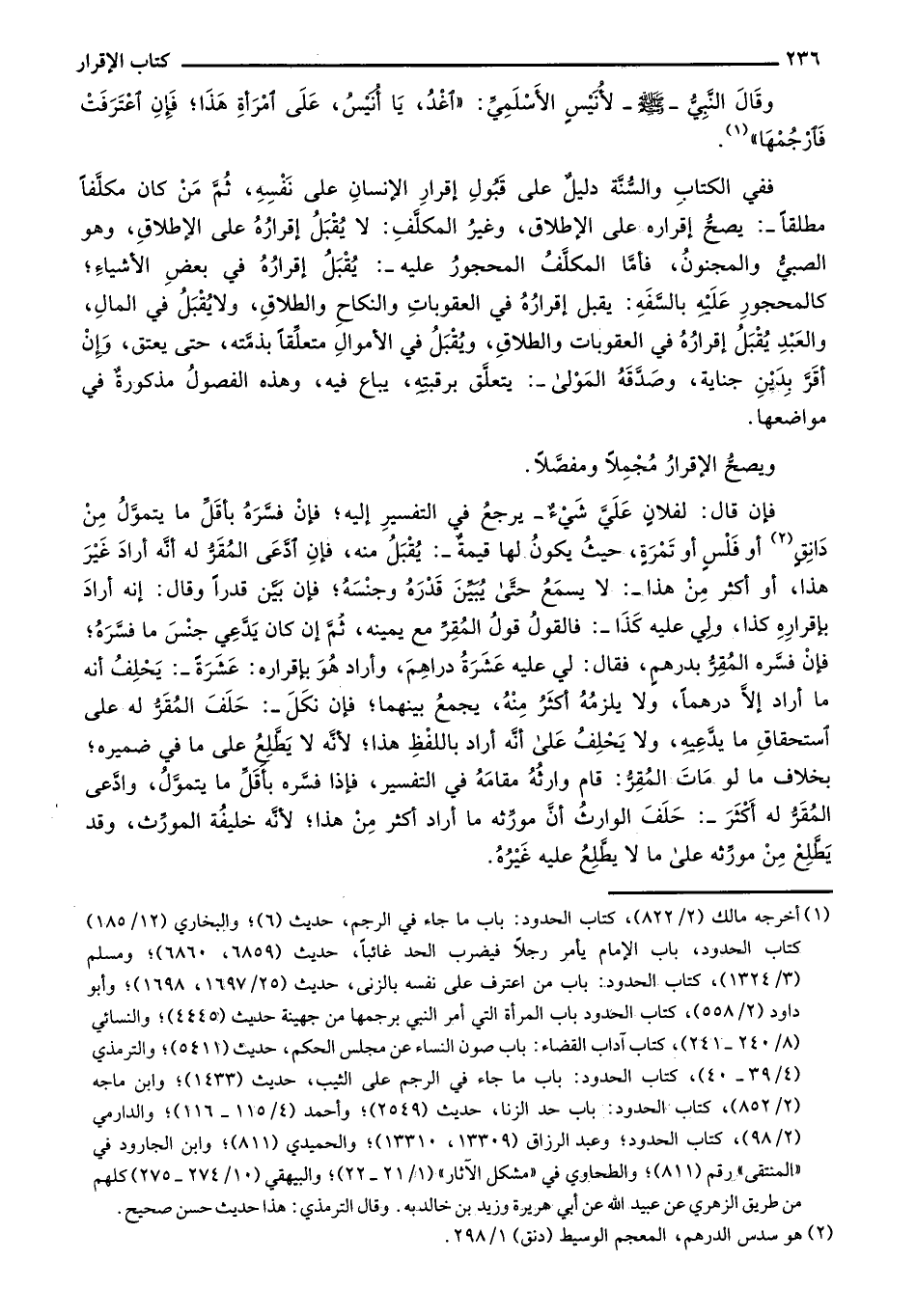 ففي الكتاب والسنة دليل على قبول إقرار الإنسان على نفسه، ثم من كان مكلفاً مطلقاً: يصح إقراره على الإطلاق، وغير المكلف: لا يُقبل إقراره على الإطلاق، وهو الصبي والمجنون، فأما المكلف المحجور عليه: يُقبل إقراره في بعض الأشياء؛ كالمحجور عليه بالسفه: يقبل إقراره في العقوبات والنكاح والطلاق، ولا يُقبل في المال، والعبد يُقبل إقراره في العقوبات والطلاق، ويُقبل في الأموال متعلقاً بذمته، حتى يعتق، وإن أقر بدين جناية، وصدقه المولى: يتعلق برقبته، يباع فيه، وهذه الفصول مذكورة في مواضعها.