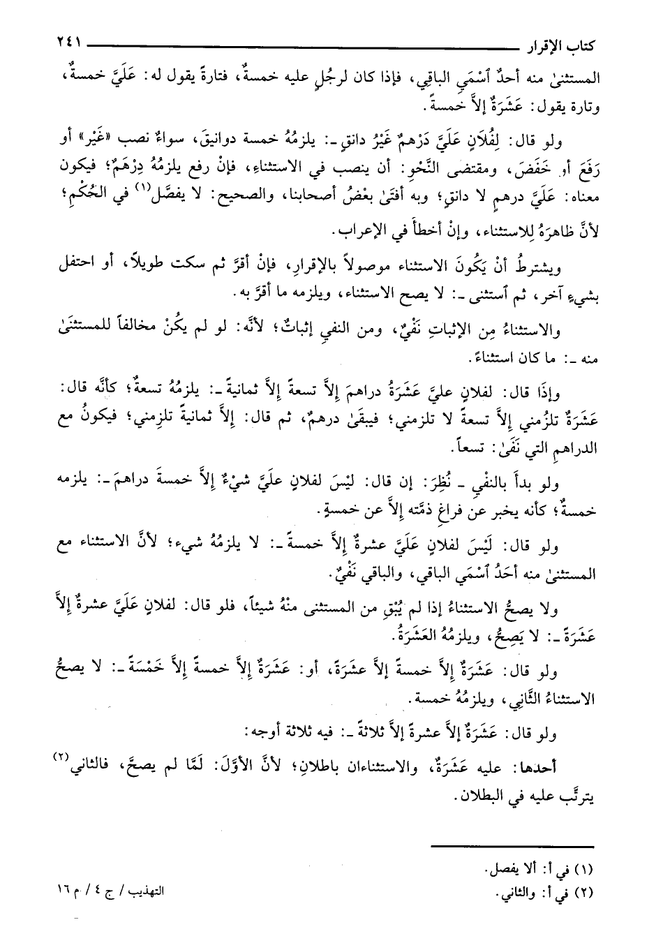 ولو بدأ بالنفي- نُظر: إن قال: ليس لفلان عليَّ شيءٌ إلا خمسة دراهم: يلزمه خمسة؛ كأنه يخبر عن فراغ ذمته إلا عن خمسة.
