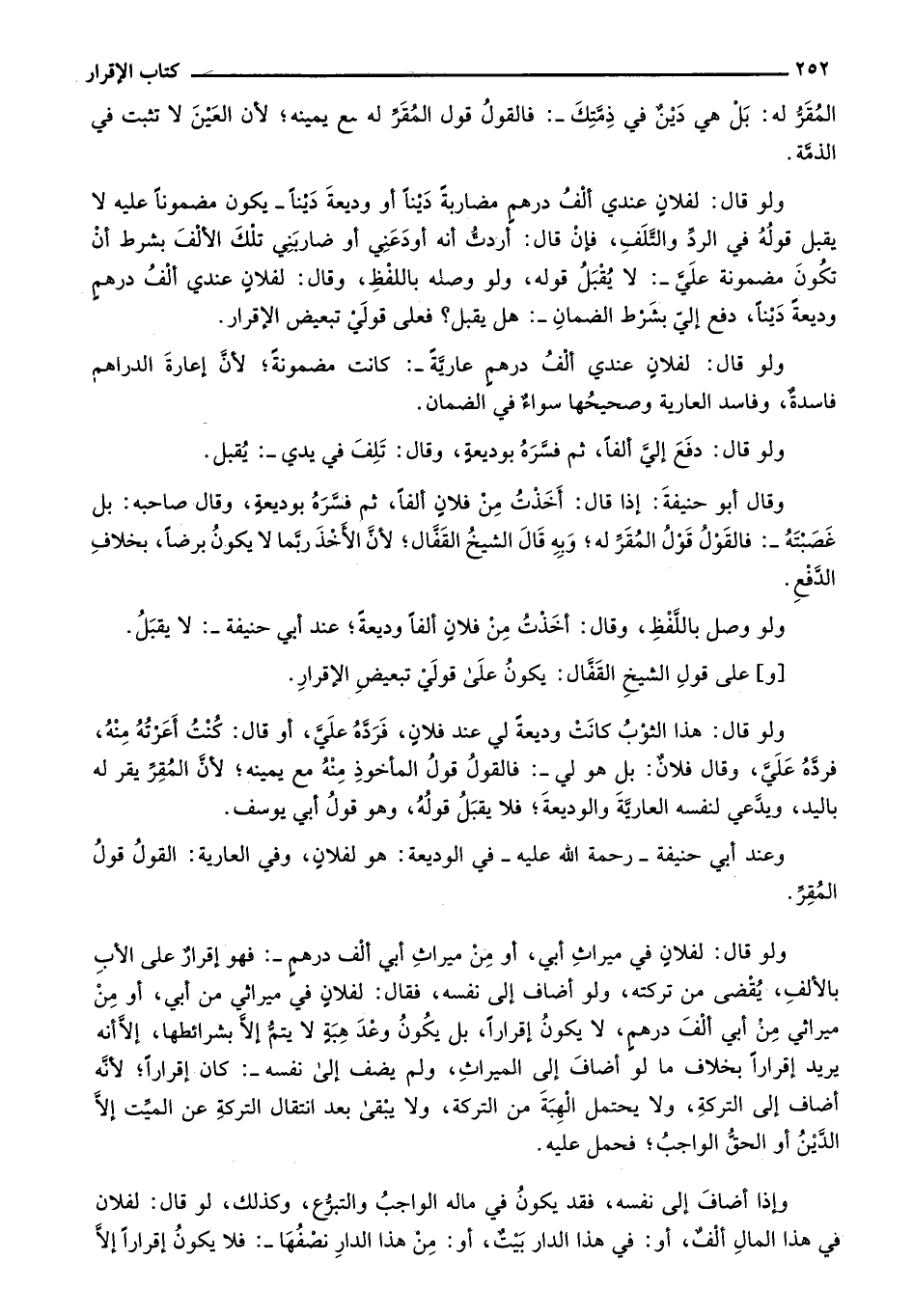 وإذا أضاف إلى نفسه، فقد يكون في ماله الواجب والتبرع، وكذلك، لو قال: لفلان في هذا المال ألف، أو: في هذا الدار بيتٌ، أو: من هذا الدار نصفها: فلا يكون إقراراً إلا