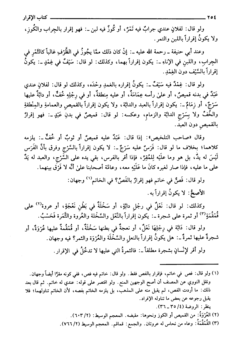 ولو قال: غمدٌ فيه سيف: يكون إقراره بالغمد وحده، وكذلك لو قال: لفلان عندي عبدٌ في بدنه قميص، أو على رأسه عمامةٌ، أو عليه منطقة، أو في رجله خُفٌّ، أو دابة عليها سرج، أو زمام: يكون إقراراً بالعبد والدابة، ولا يكون إقراراً بالقميص والعمامة والمنطقة والخُف ولا بسرج الدابة والزمان، وعكسه: لو قال: قميص في بدن عبد: فهو إقرار بالقميص دون العبد.