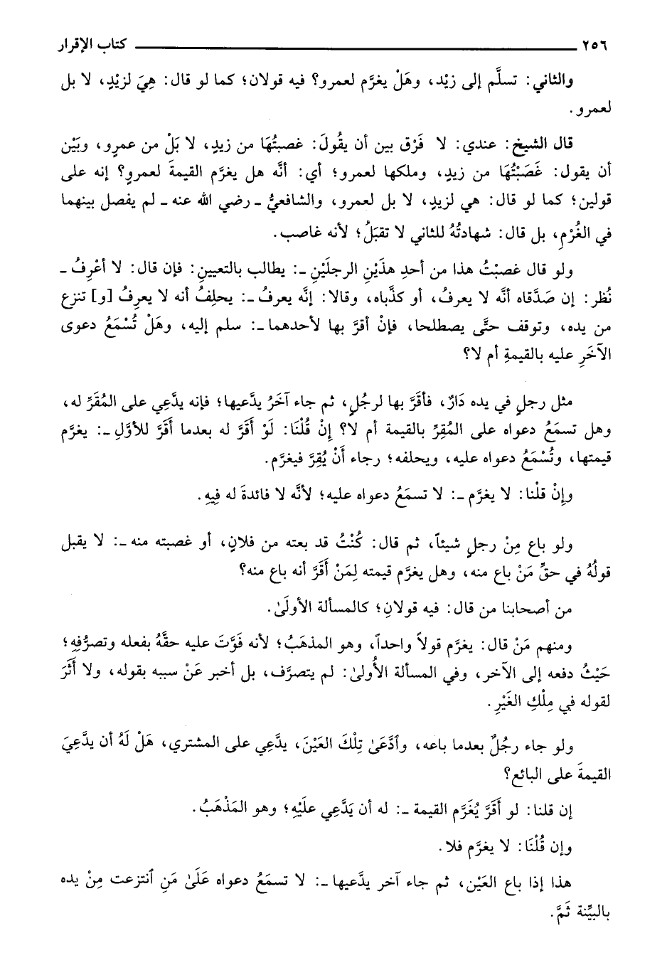 قال الشيخ: عندي: لا فرق بين أن يقول: غصبتها من زيد، لا بل من عمرو، وبين أن يقول: غصبتها من زيد، وملكها لعمرو؛ أي: أنه هل يغرَّم القيمة لعمرو؟ إنه على قولين؛ كما لو قال: هي لزيد، لا بل لعمرو، والشافعي- رضي الله عنه- لم يفصل بينهما في الغرم، بل قال: شهادته للثاني لا تقبل؛ لأنه غاصب.