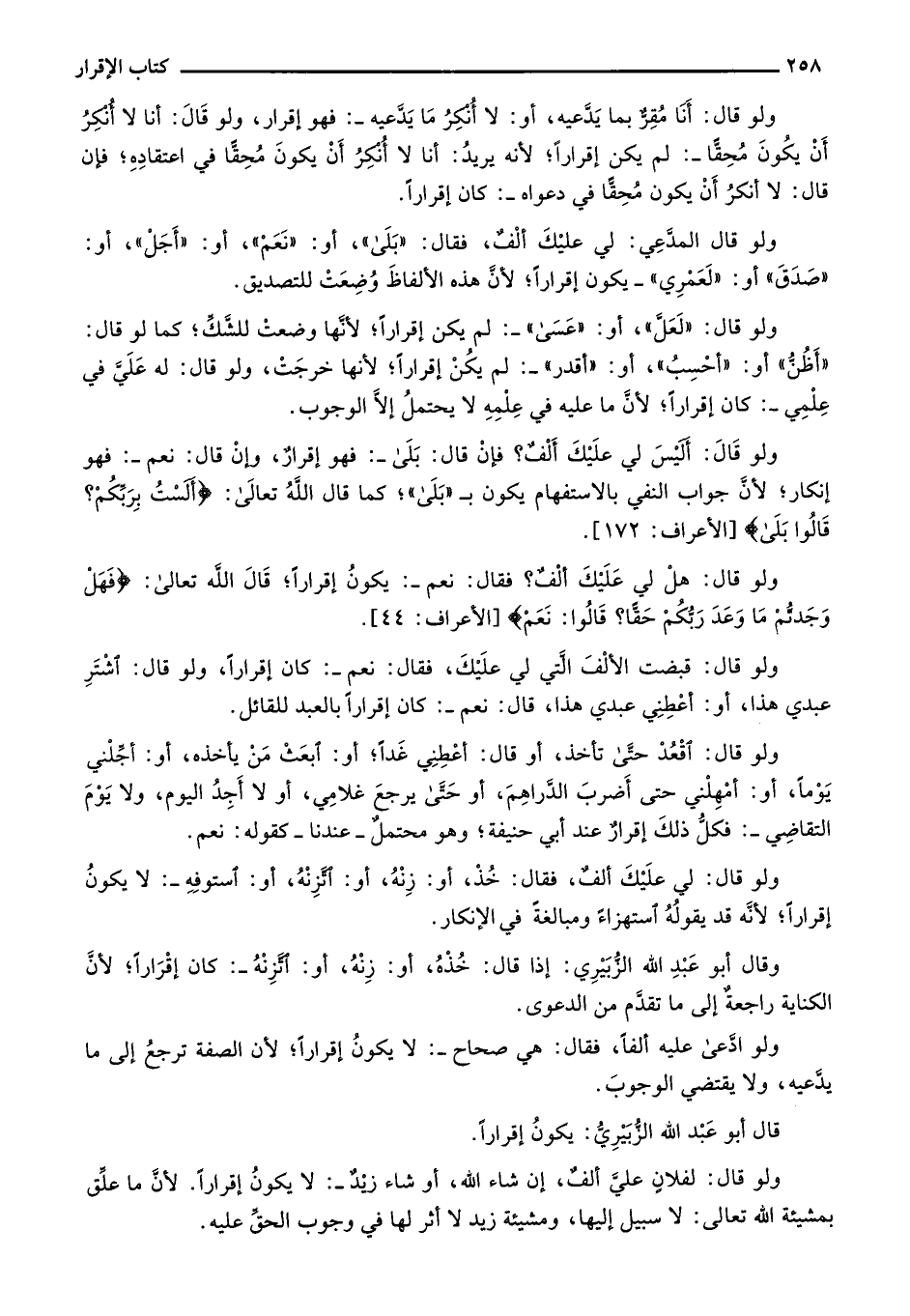 ولو قال: أليس لي عليك ألف؟ فإن قال: بلى: فهو إقرار، وإن قال: نعم: فهو إنكار؛ لأن جواب النفي بالاستفهام يكون بـ "بلى"؛ كما قال الله تعالى: {أَلَسْتُ بِرَبِّكُمْ قَالُوا بَلَى} [الأعراف: 172].