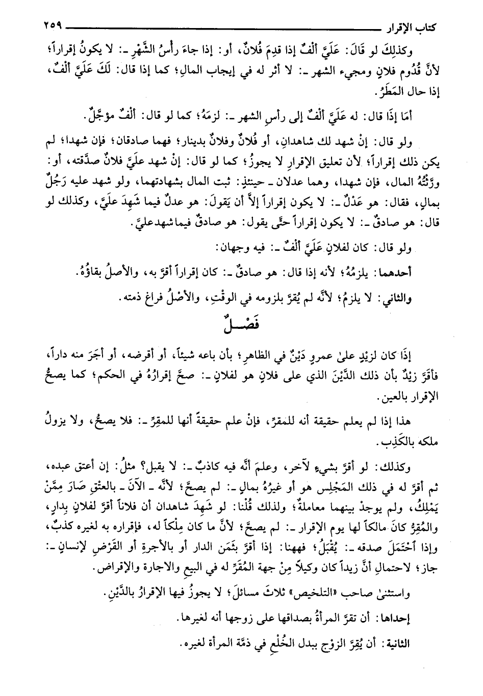 واستثنى صاحب "التلخيص" ثلاث مسائل؛ لا يجوز فيها الإقرار بالدين.