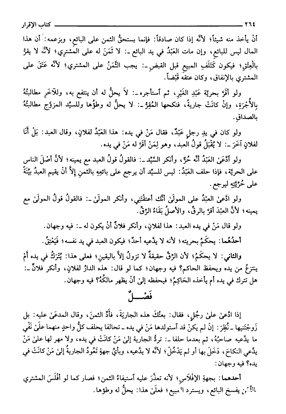 ولو كان في يد رجل عبدٌ، فقال من في يده: هذا العبد لفلان، وقال العبد: بل أنا لفلان آخر: لا يُقبل قول العبد، وهو لمن أقر له من في يده.