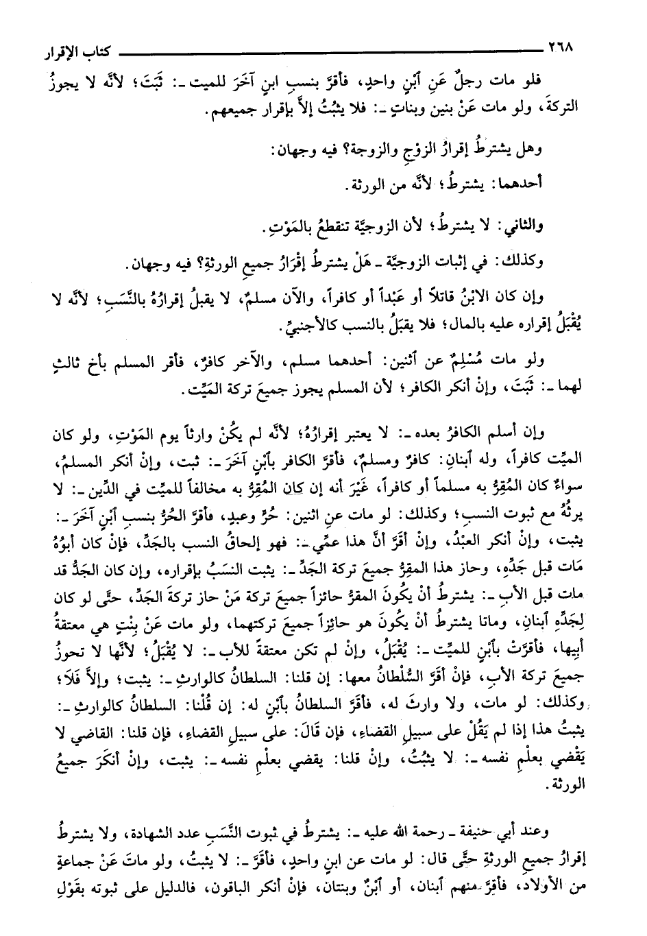 وكذلك: في إثبات الزوجية- هل يشترط إقرار جميع الورثة؟ فيه وجهان.