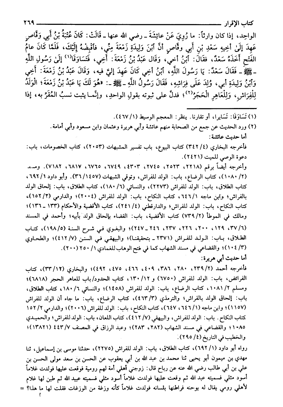 الواحد، إذا كان وارثاً: ما روي عن عائشة- رضي الله عنها- قالت: كان عُتبة بن أبي وقاص عهد إلى أخيه سعد بن أبي وقاص أن ابن وليدة زمعة مني، فاقبضه إليك، فلما كان عام الفتح أخذه سعد، فقال: ابن أخي، وقال عبد بن زمعة: أخي، فتساوقا إلى رسول الله- صلى الله عليه وسلم- فقال سعد: يا رسول الله، ابن أخي كان عهد إلي فيه، وقال عبد بن زمعة: أخي وابن وليدة أبي، ولد على فراشه، فقال رسول الله- صلى الله عليه وسلم-: "هو لك يا عبد بن زمعة؛ الولد للفراش، وللعاهر الحجر؛ فدل على ثبوته بقول الواحد، وإنما يثبت نسب المقر به، إذا