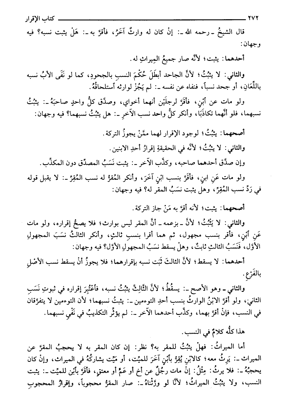 قال الشيخ- رحمه الله-: إن كان له وارث آخر، فأقر به: هل يثبت نسبه؟ فيه وجهان: