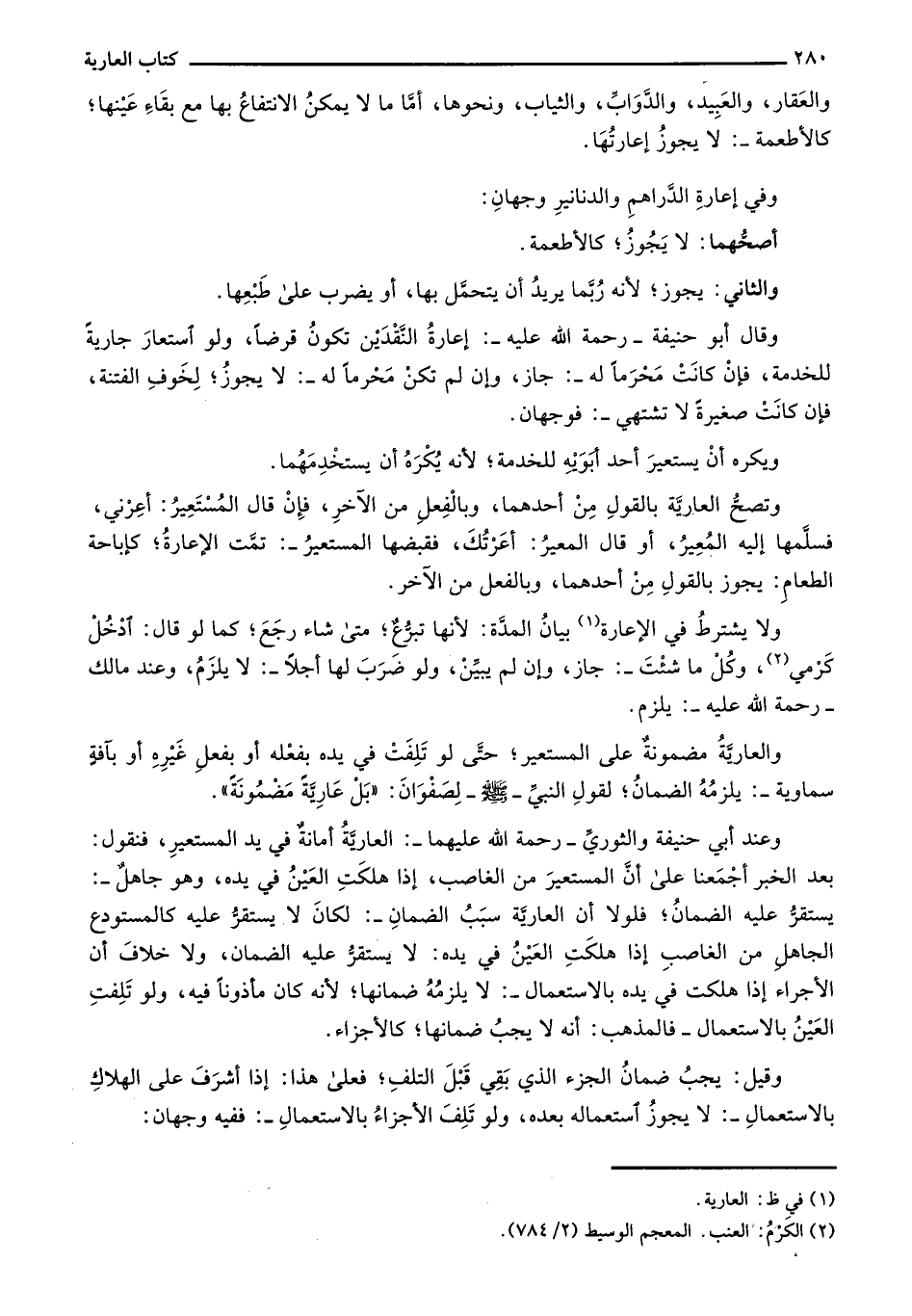 وقال أبو حنيفة- رحمة الله عليه-: إعارة النقدين تكون قرضاً، ولو استعار جارية للخدمة، فإن كانت محرماً له: جاز، وإن لم تكن محرماً له: لا يجوز؛ لخوف الفتنة، فإن كانت صغيرة لا تشتهي: فوجهان.