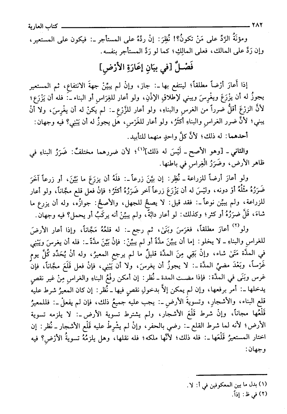 إذا أعار أرضاً مطلقاً؛ لينتفع بها: جاز، وإن لم يبين جهة الانتفاع، ثم المستعير يجوز له أن يزرع ويغرس ويبني لإطلاق الإذن، ولو أعار للغراس أو البناء: فله أن يزرع؛ لأن الزرع أقل ضرراً من الغرس والبناء، ولو أعار للزرع: لم يكن له أن يغرس، ولا أن يبني؛ لأن ضرر الغراس والبناء أكثر، ولو أعار للغرس، هل يجوز له أن يبني؟ فيه وجهان: