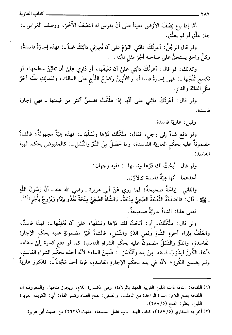 والثاني: إباحة صحيحة؛ لما روي عن أبي هريرة- رضي الله عنه- أن رسول الله- صلى الله عليه وسلم- قال: "الصدقة اللقحة الصفي منحة، والشاة الصفي منحة تغدو بإناء وتروج بأجر".