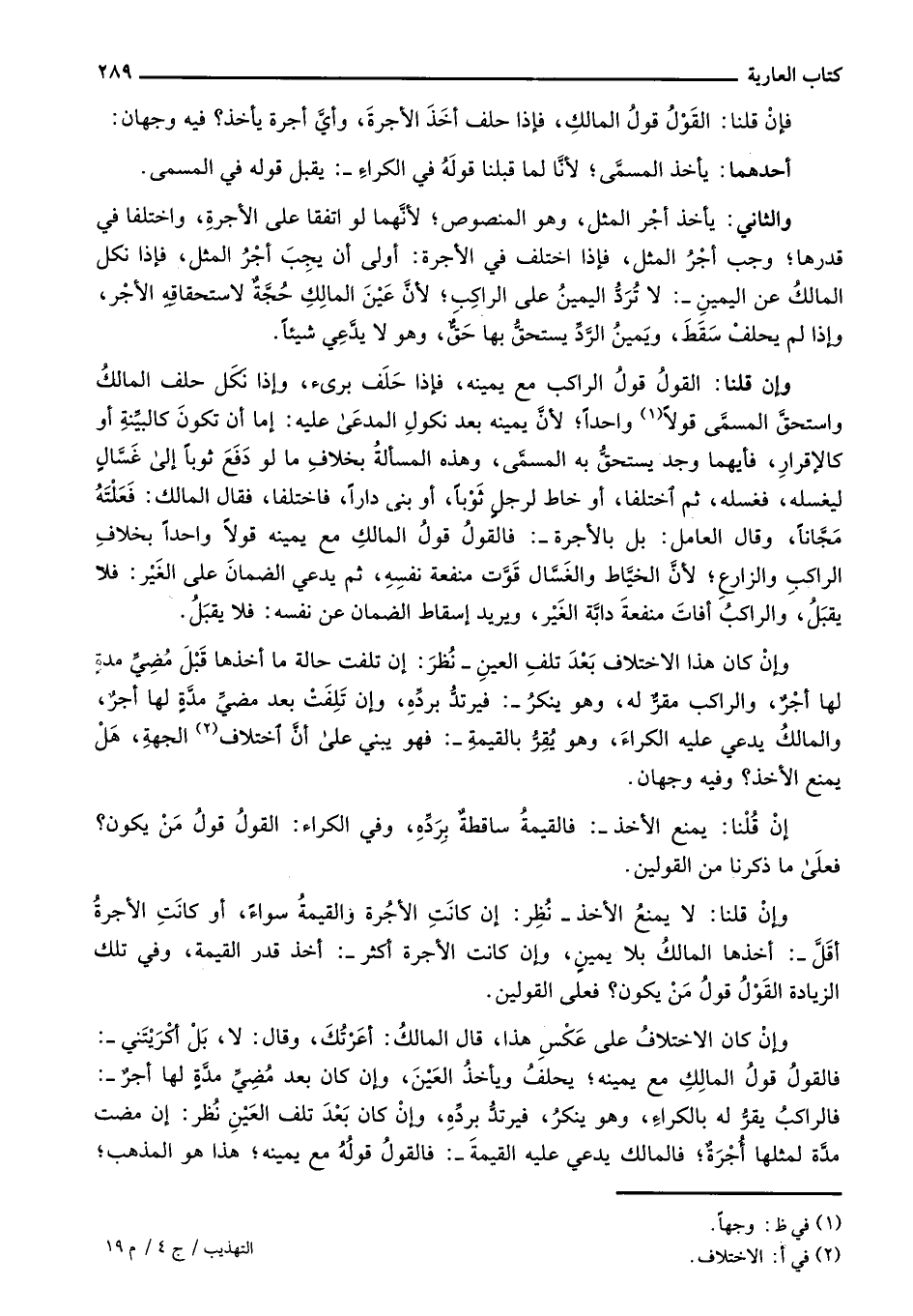وإن قلنا: القول قول الراكب مع يمينه، فإذا حلف برئ، وإذا نكل حلف المالك واستحق المسمى قولاً واحداً؛ لأن يمينه بعد نكول المدعى عليه: إما أن تكون كالبينة أو كالإقرار، فأيهما وجد يستحق به المسمى، وهذه المسألة بخلاف ما لو دفع ثوباً إلى غسال ليغسله، فغسله، ثم اختلفا، أو خاط لرجل ثوباً، أو بنى داراً، فاختلفا، فقال المالك: فعلته مجاناً، وقال العامل: بل بالأجرة: فالقول قول المالك مع يمينه قولاً واحداً بخلاف الراكب والزارع؛ لأن الخياط والغسال قوت منفعة نفسه، ثم يدعي الضمان على الغير: فلا يقبل، والراكب أفات منفعة دابة الغير، ويريد إسقاط الضمان عن نفسه: فلا يقبل.