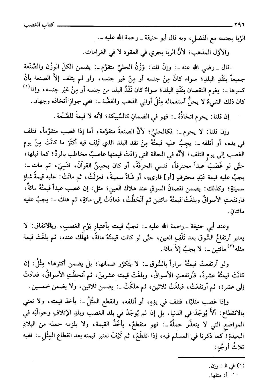 وإن قلنا: لا يحرم: فكالحلي؛ لأن الصنعة متقومة، أما إذا غصب متقوماً، فتلف في يده، أو أتلفه: يجب عليه قيمته من نقد البلد الذي تلف فيه أكثر ما كانت من يوم الغصب إلى يوم التلف، لأنه في الحالة التي زادت قيمتها غاصب مخاطب بالرد؛ كما قبلها، حتى لو غصب عبداً محترفاً، فنسي الحرفة، أو كان يحسن القرآن، فنسي، ثم مات: يجب عليه قيمة عبد محترف [أو] قارئ، أو شاة سمينة، فعزلت، ثم ماتت: عليه قيمة شاة سمينة، وكذلك: يضمن نقصان السوق عند هلاك العين، مثل: إن غصب عبداً قيمته مائة، فارتفعت الأسواق وبلغت قيمته مائتين ثم انحطت، فعادت إلى مائة، ثم هلك: يجب عليه مائتان.