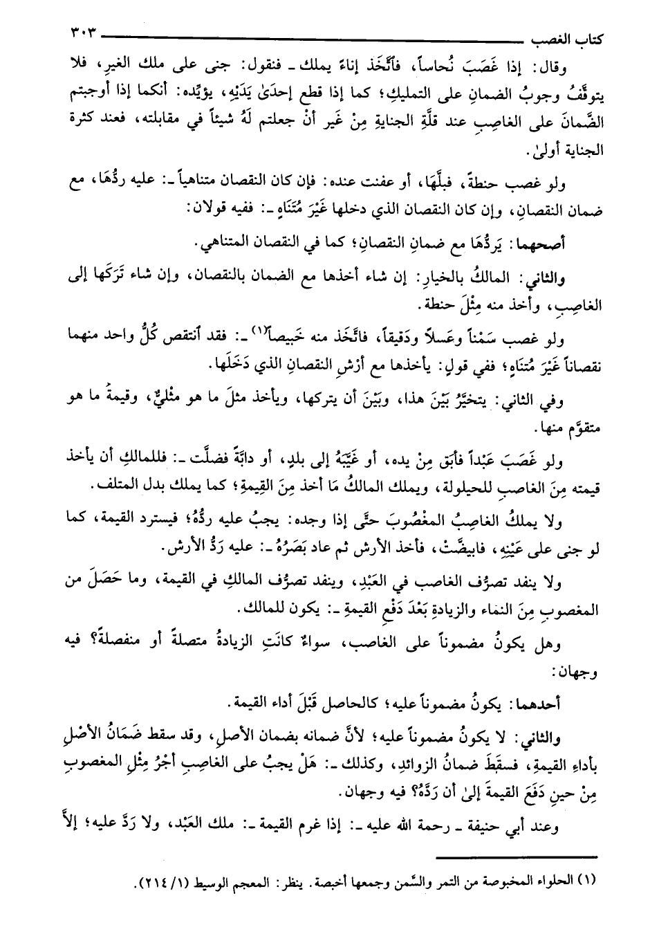 وقال: إذا غصب نحاساً، فاتخذ إناء يملك- فنقول: جنى على ملك الغير، فلا يتوقف وجوب الضمان على التمليك؛ كما إذا قطع إحدى يديه، يؤيده: أنكما إذا أوجبتم الضمان على الغاصب عند قلة الجناية من غير أن جعلتم له شيئاً في مقابلته، فعند كثرة الجناية أولى.