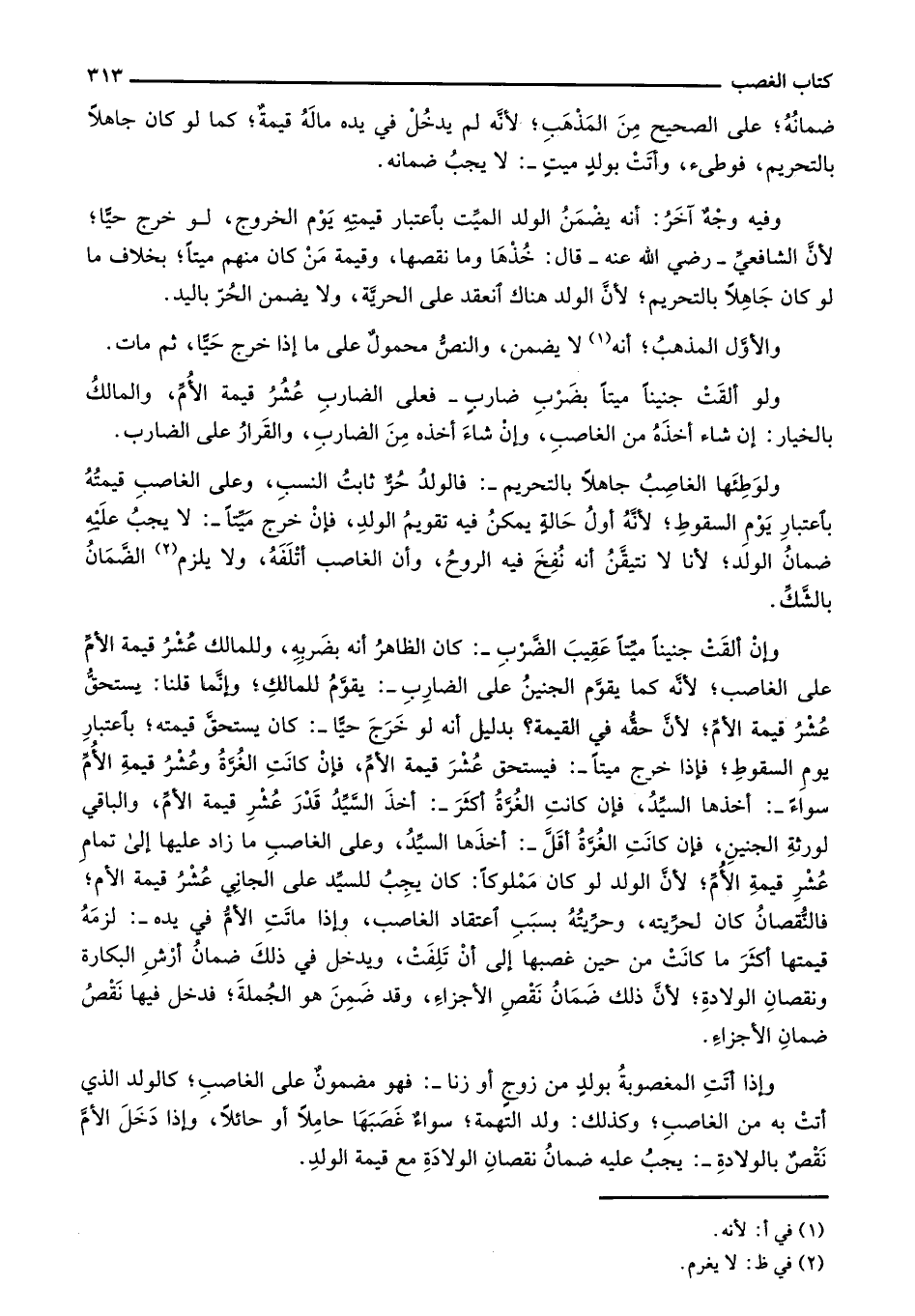 وإذا أتت المغصوبة بولد من زوج أو زنا: فهو مضمون على الغاصب، كالولد الذي أتت به من الغاصب؛ وكذلك: ولد التهمة؛ سواء غصبها حاملاً أو حائلاً، وإذا دخل الأم نقص بالولادة: يجب عليه ضمان نقصان الولادة مع قيمة الولد.