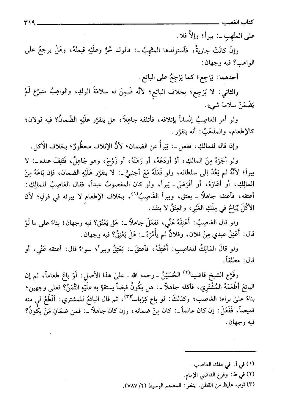 وفرع الشيخ قاضينا الحسين- رحمه الله- على هذا الأصل: لو باع طعاماً، ثم إن البائع أطعمه المشتري، فأكله جاهلاً: هل يكون قبضاً يستقر به عليه الثمن؟ فعلى وجهين؛ بناءً على براءة الغاصب؛ وكذلك: لو باع كرباساً، ثم قال البائع للمشتري: اقطع لي منه قميصاً، ففعل: إن كان عالماً: كان من ضمانه، وإن كان جاهلاً: فمن ضمان من يكون؟ فيه وجهان.