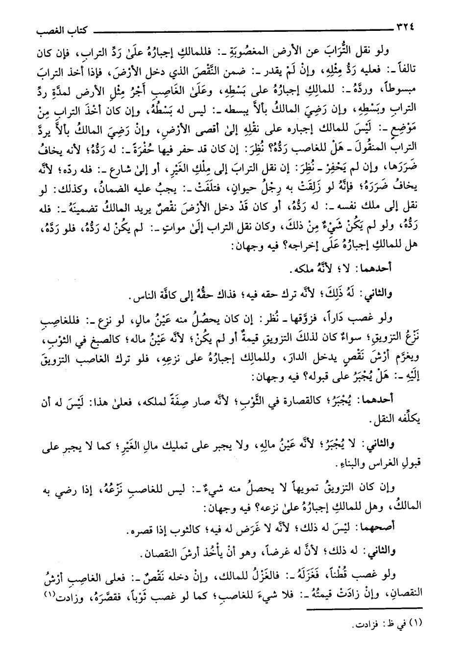 ولو نقل التراب عن الأرض المغصوبة: فللمالك إجباره على رد التراب، فإن كان تالفاً: فعليه رد مثله، وإن لم يقدر: ضمن النقص الذي دخل الأرض، فإذا أخذ التراب مبسوطاً، ورده: للمالك إجباره على بسطه، وعلى الغاصب أجر مثل الأرض لمدة رد التراب وبسطه، وإن رضي المالك بألا يبسطه: ليس له بسطه، وإن كان أخذ التراب من موضع: ليس للمالك إجباره على نقله إلى أقصى الأرض، وإن رضي المالك بألا يرد التراب المنقول- هل للغاصب رده؟ نُظر: إن كان قد حفر فيها حفرة: له رده؛ لأنه يخاف ضررها، وإن لم يحفر- نُظر: إن نقل التراب إلى ملك الغير، أو إلى شارع: فله رده؛ لأنه يخاف ضرره؛ فإنه لو زلقت به رجل حيوان، فتلفت: يجب عليه الضمان، وكذلك: لو نقل إلى ملك نفسه: له رده، أو كان قد دخل الأرض نقص يريد المالك تضمينه: فله رده، ولو لم يكن شيء من ذلك، وكان نقل التراب إلى موات: لم يكن له رده، فلو رده، هل للمالك إجباره على إخراجه؟ فيه وجهان: