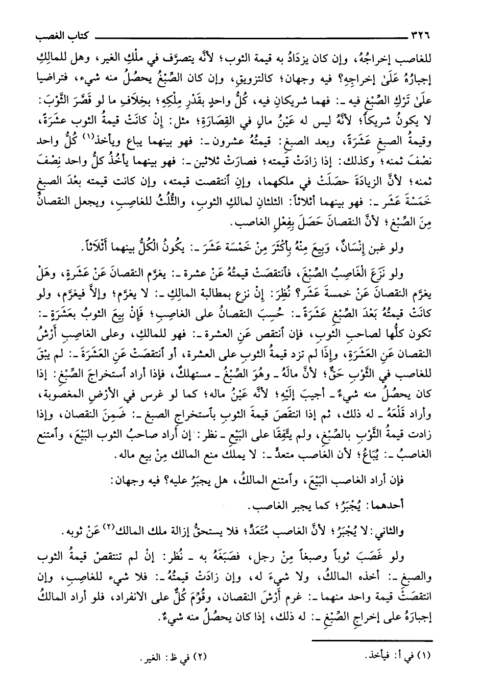 للغاصب إخراجه، وإن كان يزداد به قيمة الثوب؛ لأنه يتصرف في ملك الغير، وهل للمالك إجباره على إخراجه؟ فيه وجهان؛ كالتزويق، وإن كان الصبغ يحصل منه شيء، فتراضيا على ترك الصبغ فيه: فهما شريكان فيه، كل واحدب قدر ملكه؛ بخلاف ما لو قصر الثوب: لا يكون شريكاً؛ لأنه ليس له عين مال في القصارة؛ مثل: إن كانت قيمة الثوب عشرة، وقيمة الصبغ عشرة، وبعد الصبغ: قيمته عشرون: فهو بينهما يباع ويأخذ كل واحد نصف ثمنه؛ وكذلك: إذا زادت قيمته؛ فصارت ثلاثين: فهو بينهما يأخذ كل واحد نصف ثمنه؛ لأن الزيادة حصلت في ملكهما، وإن انتقصت قيمته، وإن كانت قيمته بعد الصبغ خمسة عشر: فهو بينهما أثلاثاً: الثلثان لمالك الثوب، والثلث للغاصب، ويجعل النقصان من الصبغ؛ لأن النقصان حصل بفعل الغاصب.