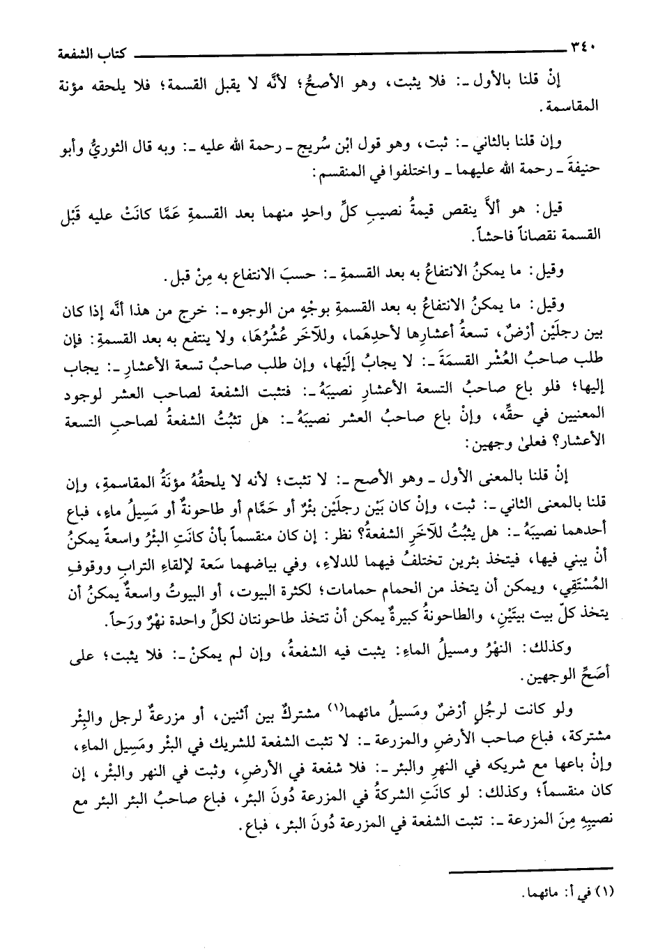إن قلنا بالمعنى الأول- وهو الأصح-: لا تثبت؛ لأنه لا يلحقه مؤنة المقاسمة، وإن قلنا بالمعنى الثاني: ثبت، وإن كان بين رجلين بئر أو حمام أو طاحونة أو مسيل ماء، فباع أحدهما نصيبه: هل يثبت للآخر الشفعة؟ نظر: إن كان منقسماً بأن كانت البئر واسعة يمكن أن يبني فيها، فيتخذ بئرين تختلف فيهما للدلاء، وفي بياضهما سعة لإلقاء التراب ووقوف المستقي، ويمكن أن يتخذ من الحمام حمامات، لكثرة البيوت، أو البيوت واسعة يمكن أن يتخذ كل بيت بيتين، والطاحونة كبيرة يمكن أن تتخذ طاحونتان لكل واحدة نهر ورحاً.