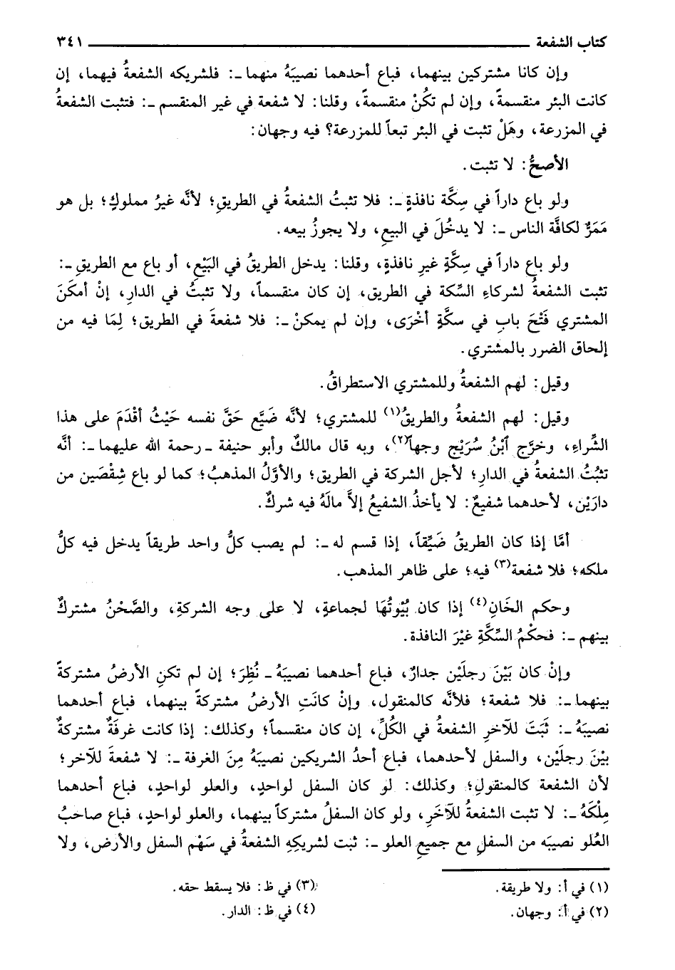 وقيل: لهم الشفعة والطريق للمشتري؛ لأنه ضيع حق نفسه حيث أقدم على هذا الشراء، وخرج ابن سريج وجهاً، وبه قال مالك وأبو حنيفة- رحمة الله عليهما-: أنه تثبت الشفعة في الدار؛ لأجل الشركة في الطريق؛ والأول المذهب؛ كما لو باع شقصين من دارين، لأحدهما شفيعٌ: لا يأخذ الشفيع إلا ماله فيه شرك.