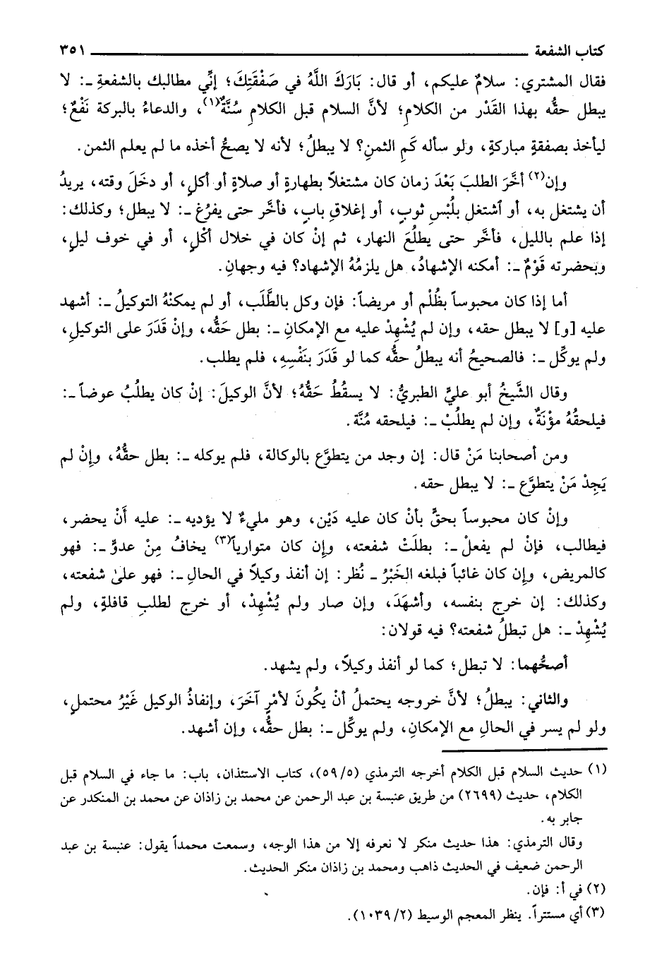 فقال المشتري: سلام عليكم، أو قال: بارك الله في صفقتك؛ إني مطالبك بالشفعة: لا يبطل حقه بهذا القدر من الكلام؛ لأن السلام قبل الكلام سنة، والدعاء بالبركة نفع؛ ليأخذ بصفقة مباركة، ولو سأله كم الثمن؟ لا يبطل؛ لأنه لا يصح أخذه ما لم يعلم الثمن.