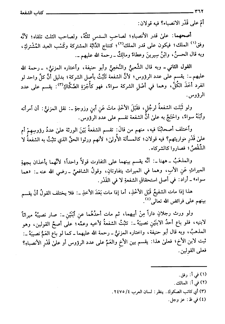 القول الثاني- وبه قال الشعبي والنخعي وأبو حنيفة، واختاره المزني،- رحمة الله عليهم: يقسم على عدد الرءوس؛ لأن الشفعة تثبت بأصل الشركة؛ بدليل أن كل واحد لو انفرد أخذ الكل، وهما في أصل الشركة سواء، فهو كأجرة الصكاك: يقسم على عدد الرءوس.