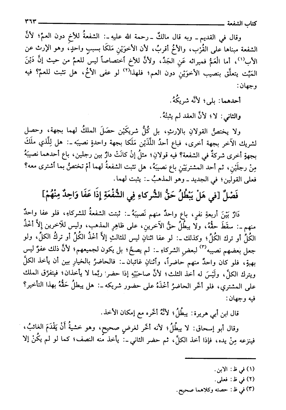 دار بين أربعة نفر، باع واحد منهم نصيبه: ثبتت الشفعة للشركاء، فلو عفا واحد منهم: سقط حقه، ولا يبطل حق الآخرين، على ظاهر المذهب، وليس للآخرين إلا أخذ الكل أو ترك الكل؛ وكذلك: لو عفا اثنان ليس للثالث إلا أخذ الكل أو ترك الكل، ولو جعل بعضهم نصيبه لبعض الشركاء: لم يصح؛ بل يكون لجميعهم؛ لأن ذلك عفو ليس بهبة، فلو كان واحد منهم حاضراً، واثنان غائبان: فالحاضر بالخيار بين أن يأخذ الكل ويترك الكل، وليس له أخذ الثلث؛ لأن صاحبيه إذا حضر ربما لا يأخذان؛ فيتفرق الملك على المشتري، فلو أخر الحاضر أخذه على حضور شريكه: هل يبطل حقه بهذا التأخير؟ فيه وجهان: