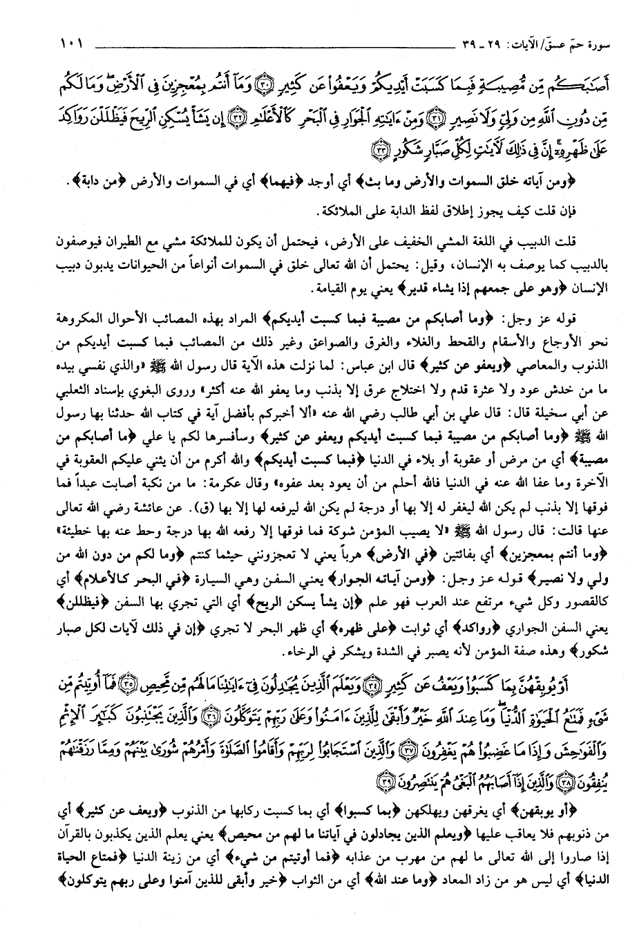 وَمِنْ آياتِهِ خَلْقُ السَّماواتِ وَالْأَرْضِ وَما بَثَّ فِيهِما مِنْ دابَّةٍ وَهُوَ عَلى جَمْعِهِمْ إِذا يَشاءُ قَدِيرٌ (29) وَما أَصابَكُمْ مِنْ مُصِيبَةٍ فَبِما كَسَبَتْ أَيْدِيكُمْ وَيَعْفُوا عَنْ كَثِيرٍ (30) وَما أَنْتُمْ بِمُعْجِزِينَ فِي الْأَرْضِ وَما لَكُمْ مِنْ دُونِ اللَّهِ مِنْ وَلِيٍّ وَلا نَصِيرٍ (31) وَمِنْ آياتِهِ الْجَوارِ فِي الْبَحْرِ كَالْأَعْلامِ (32) إِنْ يَشَأْ يُسْكِنِ الرِّيحَ فَيَظْلَلْنَ رَواكِدَ عَلى ظَهْرِهِ إِنَّ فِي ذلِكَ لَآياتٍ لِكُلِّ صَبَّارٍ شَكُورٍ (33)
