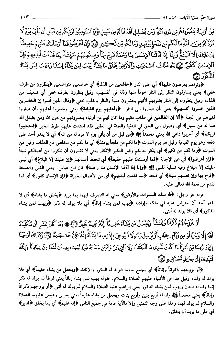 وَتَراهُمْ يُعْرَضُونَ عَلَيْها خاشِعِينَ مِنَ الذُّلِّ يَنْظُرُونَ مِنْ طَرْفٍ خَفِيٍّ وَقالَ الَّذِينَ آمَنُوا إِنَّ الْخاسِرِينَ الَّذِينَ خَسِرُوا أَنْفُسَهُمْ وَأَهْلِيهِمْ يَوْمَ الْقِيامَةِ أَلا إِنَّ الظَّالِمِينَ فِي عَذابٍ مُقِيمٍ (45) وَما كانَ لَهُمْ مِنْ أَوْلِياءَ يَنْصُرُونَهُمْ مِنْ دُونِ اللَّهِ وَمَنْ يُضْلِلِ اللَّهُ فَما لَهُ مِنْ سَبِيلٍ (46) اسْتَجِيبُوا لِرَبِّكُمْ مِنْ قَبْلِ أَنْ يَأْتِيَ يَوْمٌ لا مَرَدَّ لَهُ مِنَ اللَّهِ ما لَكُمْ مِنْ مَلْجَإٍ يَوْمَئِذٍ وَما لَكُمْ مِنْ نَكِيرٍ (47) فَإِنْ أَعْرَضُوا فَما أَرْسَلْناكَ عَلَيْهِمْ حَفِيظاً إِنْ عَلَيْكَ إِلاَّ الْبَلاغُ وَإِنَّا إِذا أَذَقْنَا الْإِنْسانَ مِنَّا رَحْمَةً فَرِحَ بِها وَإِنْ تُصِبْهُمْ سَيِّئَةٌ بِما قَدَّمَتْ أَيْدِيهِمْ فَإِنَّ الْإِنْسانَ كَفُورٌ (48) لِلَّهِ مُلْكُ السَّماواتِ وَالْأَرْضِ يَخْلُقُ ما يَشاءُ يَهَبُ لِمَنْ يَشاءُ إِناثاً وَيَهَبُ لِمَنْ يَشاءُ الذُّكُورَ (49)