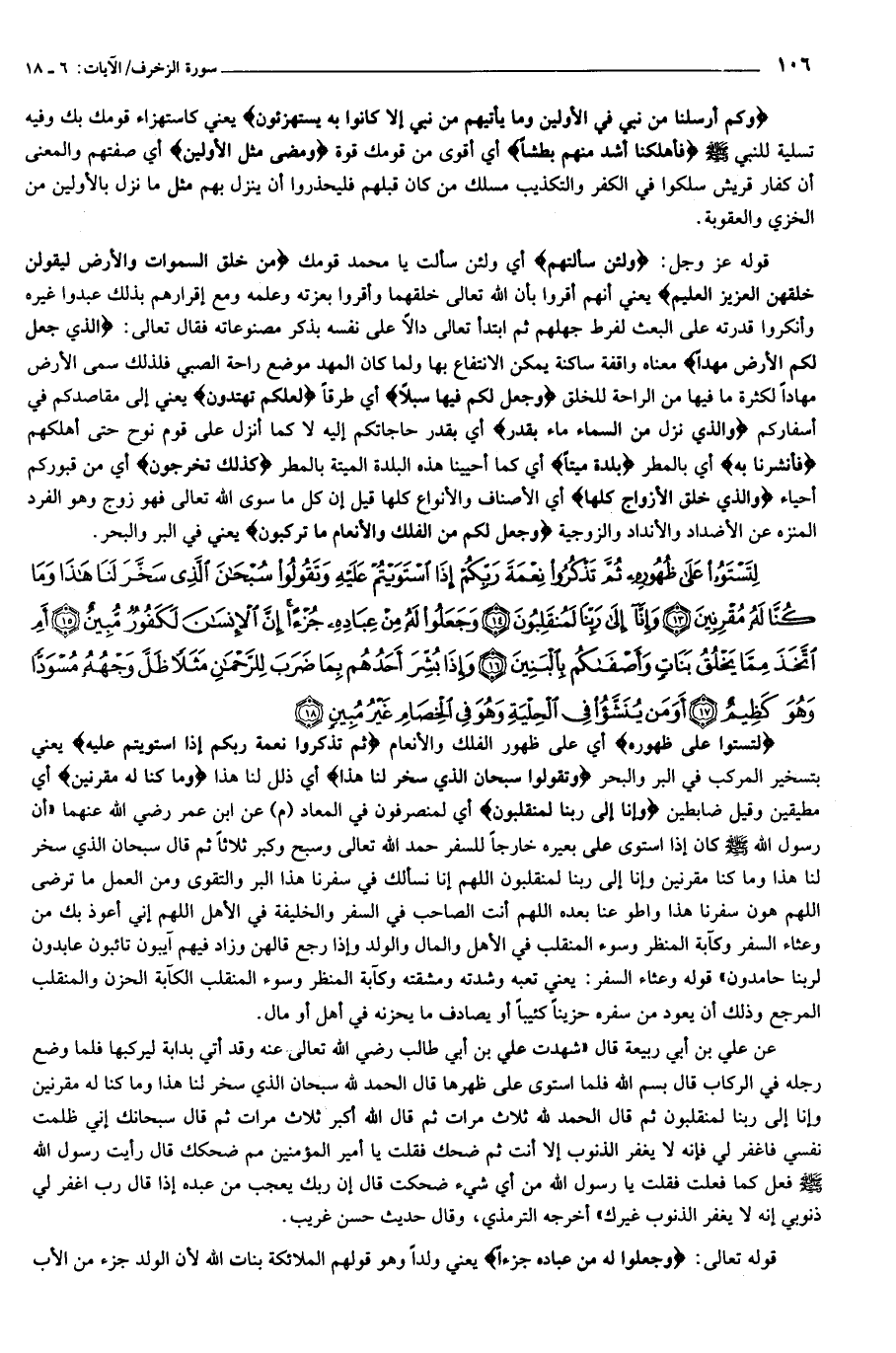 لِتَسْتَوُوا عَلى ظُهُورِهِ أي على ظهور الفلك والأنعام ثُمَّ تَذْكُرُوا نِعْمَةَ رَبِّكُمْ إِذَا اسْتَوَيْتُمْ عَلَيْهِ يعني بتسخير المركب في البر والبحر وَتَقُولُوا سُبْحانَ الَّذِي سَخَّرَ لَنا هذا أي ذلل لنا هذا وَما كُنَّا لَهُ مُقْرِنِينَ أي مطيقين وقيل ضابطين وَإِنَّا إِلى رَبِّنا لَمُنْقَلِبُونَ أي لمنصرفون في المعاد (م) عن ابن عمر رضي الله عنهما «أن رسول الله صلّى الله عليه وسلّم كان إذا استوى على بعيره خارجا للسفر حمد الله تعالى وسبح وكبر ثلاثا ثم قال سبحان الذي سخر لنا هذا وما كنا مقرنين وإنا إلى ربنا لمنقلبون اللهم إنا نسألك في سفرنا هذا البر والتقوى ومن العمل ما ترضى اللهم هون سفرنا هذا واطو عنا بعده اللهم أنت الصاحب في السفر والخليفة في الأهل اللهم إني أعوذ بك من وعثاء السفر وكآبة المنظر وسوء المنقلب في الأهل والمال والولد وإذا رجع قالهن وزاد فيهم آئبون تائبون عابدون لربنا حامدون» قوله وعثاء السفر: يعني تعبه وشدته ومشقته وكآبة المنظر وسوء المنقلب الكآبة الحزن والمنقلب المرجع وذلك أن يعود من سفره حزينا كئيبا أو يصادف ما يحزنه في أهل أو مال.
