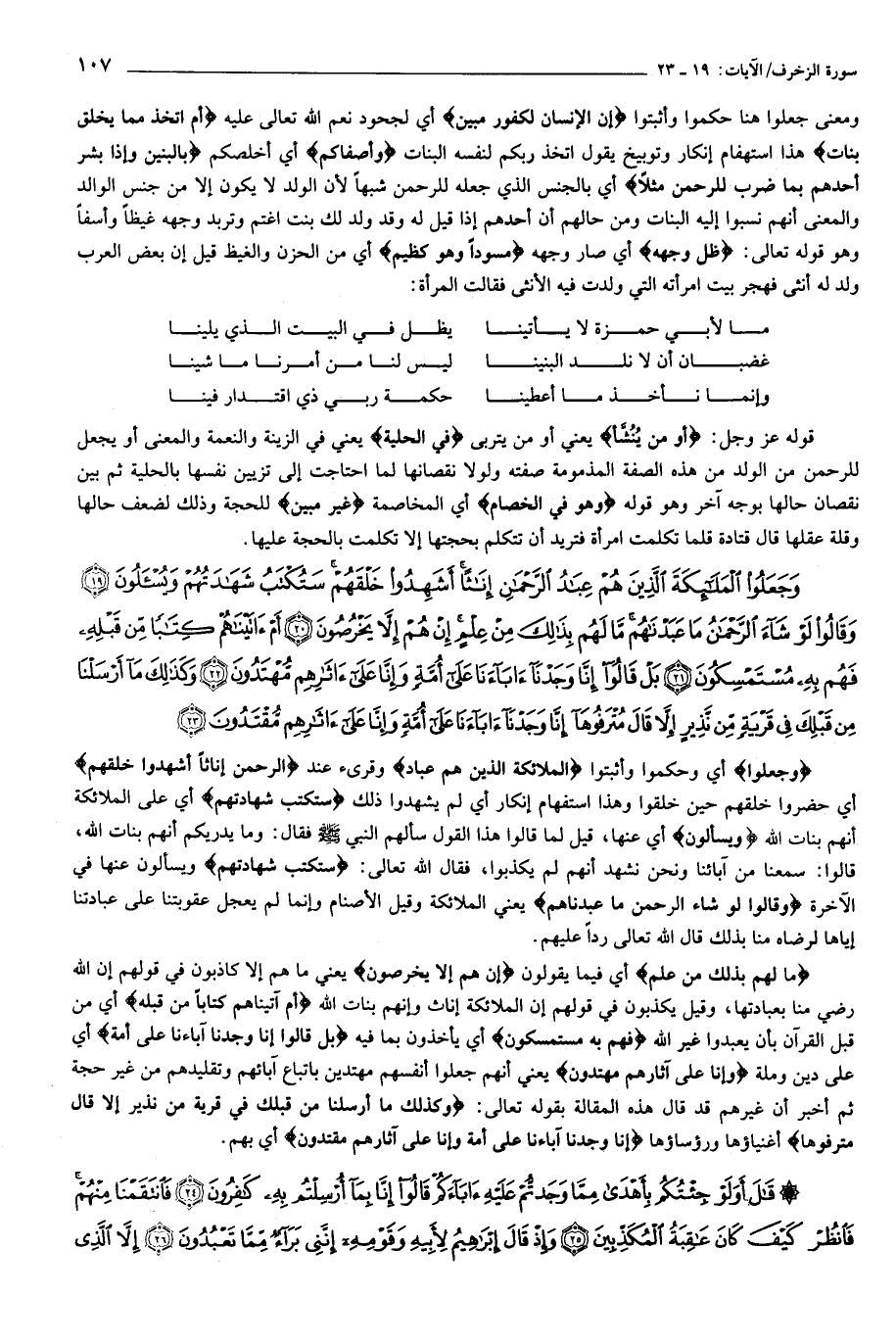 وَجَعَلُوا الْمَلائِكَةَ الَّذِينَ هُمْ عِبادُ الرَّحْمنِ إِناثاً أَشَهِدُوا خَلْقَهُمْ سَتُكْتَبُ شَهادَتُهُمْ وَيُسْئَلُونَ (19) وَقالُوا لَوْ شاءَ الرَّحْمنُ ما عَبَدْناهُمْ ما لَهُمْ بِذلِكَ مِنْ عِلْمٍ إِنْ هُمْ إِلاَّ يَخْرُصُونَ (20) أَمْ آتَيْناهُمْ كِتاباً مِنْ قَبْلِهِ فَهُمْ بِهِ مُسْتَمْسِكُونَ (21) بَلْ قالُوا إِنَّا وَجَدْنا آباءَنا عَلى أُمَّةٍ وَإِنَّا عَلى آثارِهِمْ مُهْتَدُونَ (22) وَكَذلِكَ ما أَرْسَلْنا مِنْ قَبْلِكَ فِي قَرْيَةٍ مِنْ نَذِيرٍ إِلاَّ قالَ مُتْرَفُوها إِنَّا وَجَدْنا آباءَنا عَلى أُمَّةٍ وَإِنَّا عَلى آثارِهِمْ مُقْتَدُونَ (23)