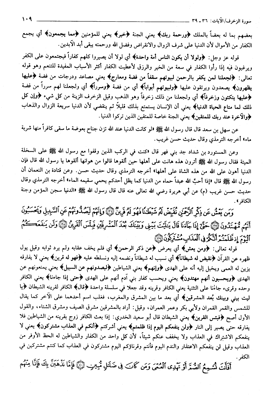 وَمَنْ يَعْشُ عَنْ ذِكْرِ الرَّحْمنِ نُقَيِّضْ لَهُ شَيْطاناً فَهُوَ لَهُ قَرِينٌ (36) وَإِنَّهُمْ لَيَصُدُّونَهُمْ عَنِ السَّبِيلِ وَيَحْسَبُونَ أَنَّهُمْ مُهْتَدُونَ (37) حَتَّى إِذا جاءَنا قالَ يا لَيْتَ بَيْنِي وَبَيْنَكَ بُعْدَ الْمَشْرِقَيْنِ فَبِئْسَ الْقَرِينُ (38) وَلَنْ يَنْفَعَكُمُ الْيَوْمَ إِذْ ظَلَمْتُمْ أَنَّكُمْ فِي الْعَذابِ مُشْتَرِكُونَ (39)