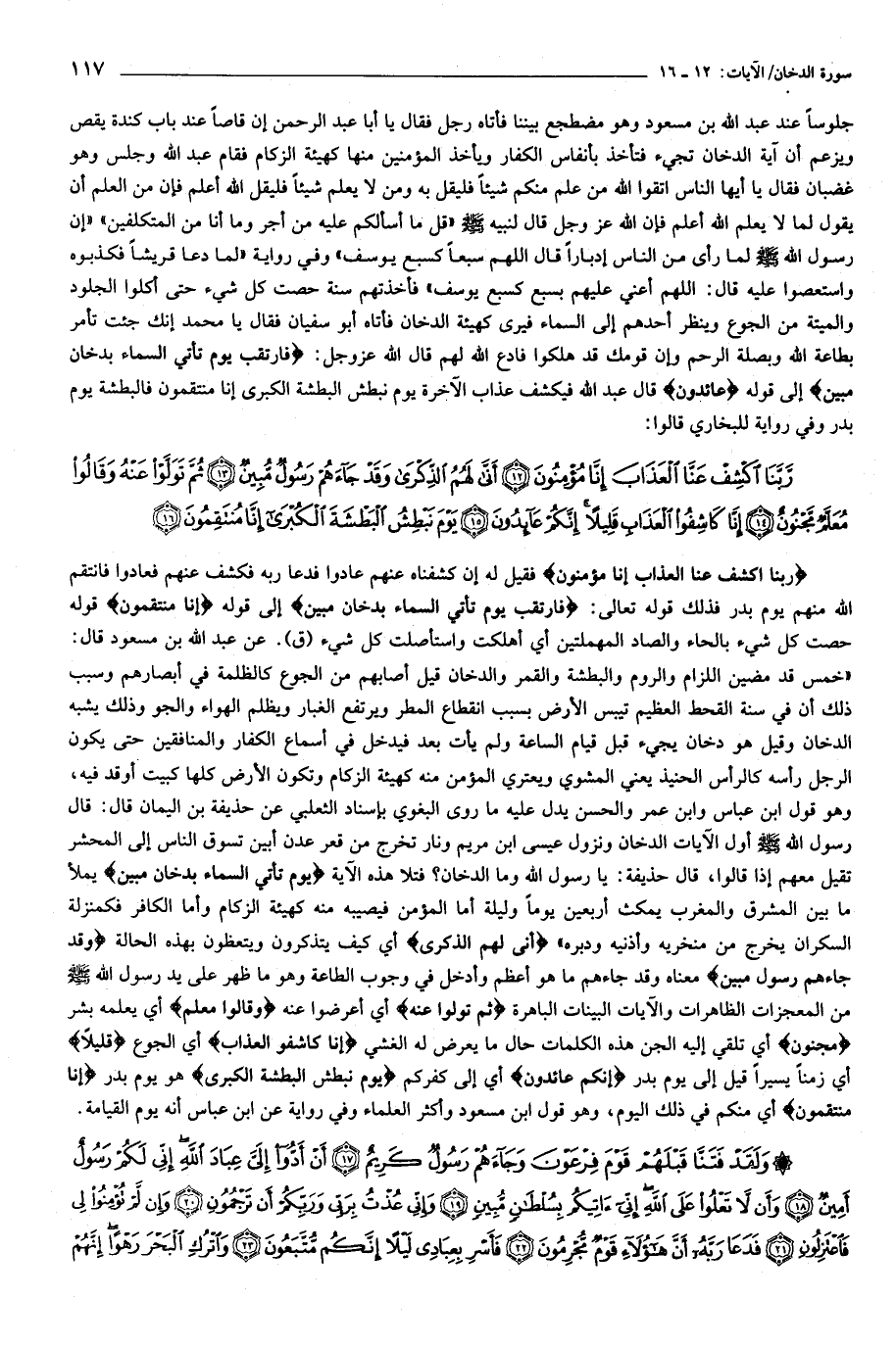 جلوسا عند عبد الله بن مسعود وهو مضطجع بيننا فأتاه رجل فقال يا أبا عبد الرّحمن إن قاصا عند باب كندة يقص ويزعم أن آية الدخان تجيء فتأخذ بأنفاس الكفار ويأخذ المؤمنين منها كهيئة الزكام فقام عبد الله وجلس وهو غضبان فقال يا أيها الناس اتقوا الله من علم منكم شيئا فليقل به ومن لا يعلم شيئا فليقل الله أعلم فإن من العلم أن يقول لما لا يعلم الله أعلم فإن الله عز وجل قال لنبيه صلّى الله عليه وسلّم «قل ما أسألكم عليه من أجر وما أنا من المتكلفين» «إن رسول الله صلّى الله عليه وسلّم لما رأى من الناس إدبارا قال اللهم سبعا كسبع يوسف» وفي رواية «لما دعا قريشا فكذبوه واستعصوا عليه قال: اللهم أعني عليهم بسبع كسبع يوسف» فأخذتهم سنة حصت كل شيء حتى أكلوا الجلود والميتة من الجوع وينظر أحدهم إلى السماء فيرى كهيئة الدخان فأتاه أبو سفيان فقال يا محمد إنك جئت تأمر بطاعة الله وبصلة الرّحم وإن قومك قد هلكوا فادع الله لهم قال الله عز وجل: فَارْتَقِبْ يَوْمَ تَأْتِي السَّماءُ بِدُخانٍ مُبِينٍ إلى قوله عائِدُونَ قال عبد الله فيكشف عذاب الآخرة يوم نبطش البطشة الكبرى إنا منتقمون فالبطشة يوم بدر وفي رواية للبخاري قالوا: