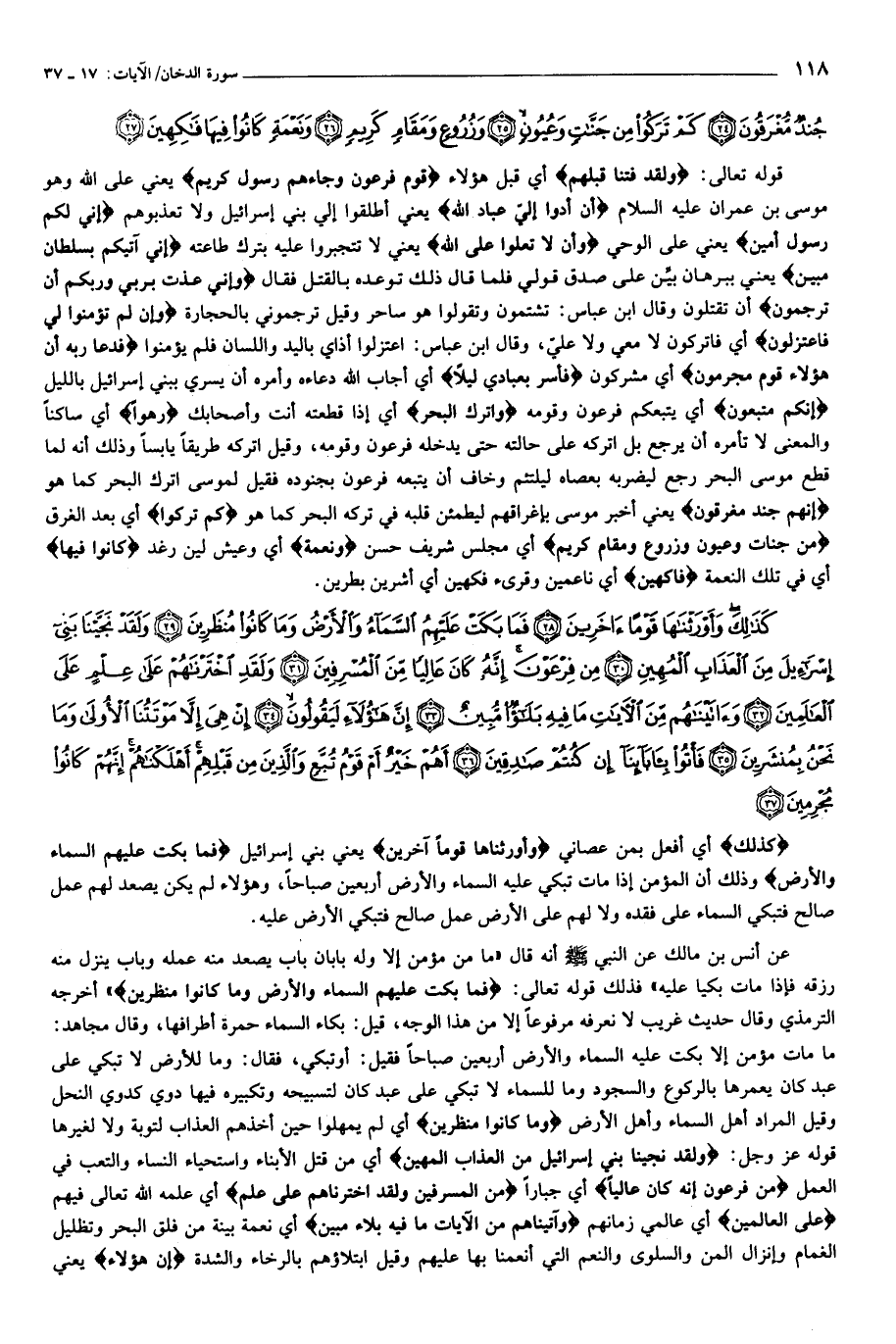 ما مات مؤمن إلا بكت عليه السماء والأرض أربعين صباحا فقيل: أو تبكي، فقال: وما للأرض لا تبكي على عبد كان يعمرها بالركوع والسجود وما للسماء لا تبكي على عبد كان لتسبيحه وتكبيره فيها دوي كدوي النحل وقيل المراد أهل السماء وأهل الأرض وَما كانُوا مُنْظَرِينَ أي لم يمهلوا حين أخذهم العذاب لتوبة ولا لغيرها قوله عز وجل: وَلَقَدْ نَجَّيْنا بَنِي إِسْرائِيلَ مِنَ الْعَذابِ الْمُهِينِ أي من قتل الأبناء واستحياء النساء والتعب في العمل مِنْ فِرْعَوْنَ إِنَّهُ كانَ عالِياً أي جبارا مِنَ الْمُسْرِفِينَ وَلَقَدِ اخْتَرْناهُمْ عَلى عِلْمٍ أي علمه الله تعالى فيهم عَلَى الْعالَمِينَ أي عالمي زمانهم وَآتَيْناهُمْ مِنَ الْآياتِ ما فِيهِ بَلؤُا مُبِينٌ أي نعمة بينة من فلق البحر وتظليل الغمام وإنزال المن والسلوى والنعم التي أنعمنا بها عليهم وقيل ابتلاؤهم بالرخاء والشدة إِنَّ هؤُلاءِ يعني
