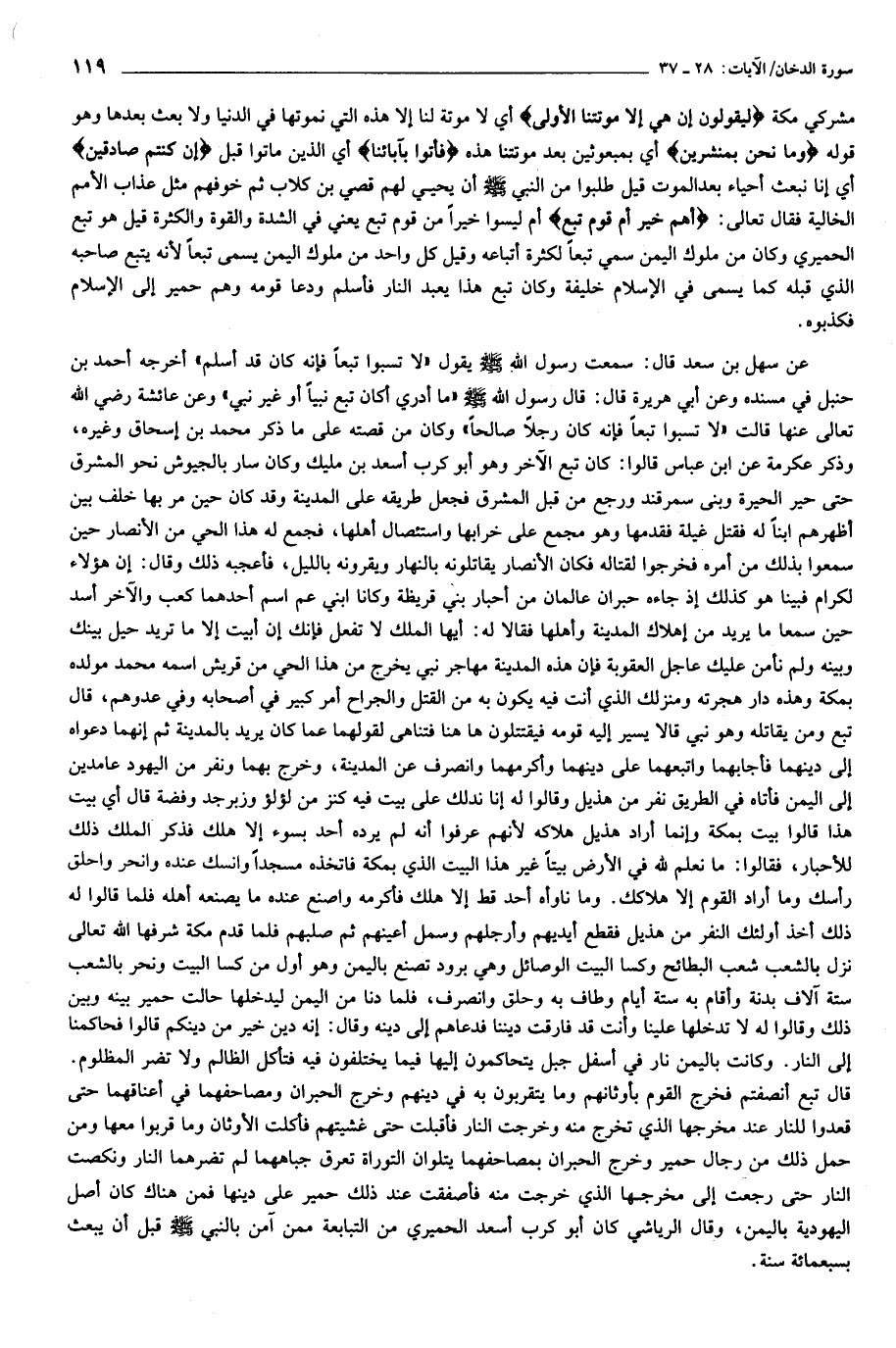 قال تبع أنصفتم فخرج القوم بأوثانهم وما يتقربون به في دينهم وخرج الحبران ومصاحفهما في أعناقهما حتى قعدوا للنار عند مخرجها الذي تخرج منه وخرجت النار فأقبلت حتى غشيتهم فأكلت الأوثان وما قربوا معها ومن حمل ذلك من رجال حمير وخرج الحبران بمصاحفهما يتلوان التوراة تعرق جباههما لم تضرهما النار ونكصت النار حتى رجعت إلى مخرجها الذي خرجت منه فأصفقت عند ذلك حمير على دينها فمن هناك كان أصل اليهودية باليمن، وقال الرياشي كان أبو كرب أسعد الحميري من التبابعة ممن آمن بالنبي صلّى الله عليه وسلّم قبل أن يبعث بسبعمائة سنة.