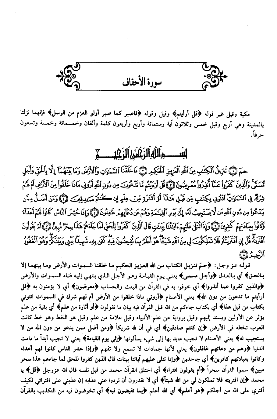 حم (1) تَنْزِيلُ الْكِتابِ مِنَ اللَّهِ الْعَزِيزِ الْحَكِيمِ (2) ما خَلَقْنَا السَّماواتِ وَالْأَرْضَ وَما بَيْنَهُما إِلاَّ بِالْحَقِّ وَأَجَلٍ مُسَمًّى وَالَّذِينَ كَفَرُوا عَمَّا أُنْذِرُوا مُعْرِضُونَ (3) قُلْ أَرَأَيْتُمْ ما تَدْعُونَ مِنْ دُونِ اللَّهِ أَرُونِي ماذا خَلَقُوا مِنَ الْأَرْضِ أَمْ لَهُمْ شِرْكٌ فِي السَّماواتِ ائْتُونِي بِكِتابٍ مِنْ قَبْلِ هذا أَوْ أَثارَةٍ مِنْ عِلْمٍ إِنْ كُنْتُمْ صادِقِينَ (4)