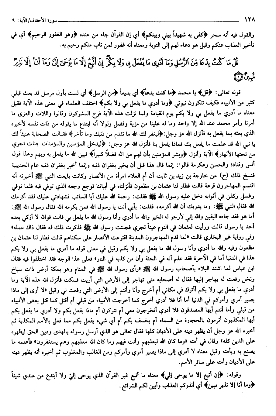 قُلْ ما كُنْتُ بِدْعاً مِنَ الرُّسُلِ وَما أَدْرِي ما يُفْعَلُ بِي وَلا بِكُمْ إِنْ أَتَّبِعُ إِلاَّ ما يُوحى إِلَيَّ وَما أَنَا إِلاَّ نَذِيرٌ مُبِينٌ (9)