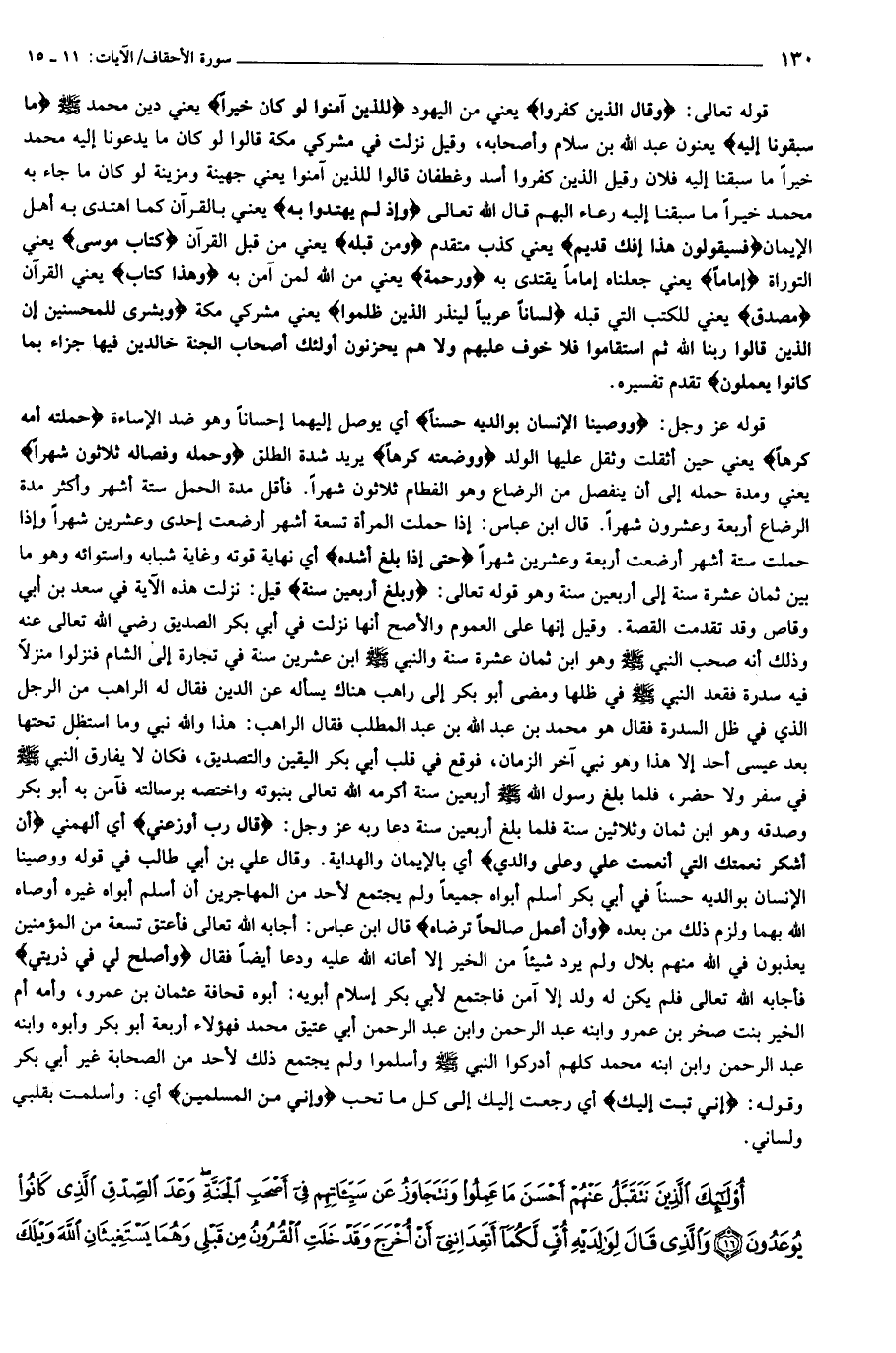وَقالَ الَّذِينَ كَفَرُوا لِلَّذِينَ آمَنُوا لَوْ كانَ خَيْراً ما سَبَقُونا إِلَيْهِ وَإِذْ لَمْ يَهْتَدُوا بِهِ فَسَيَقُولُونَ هذا إِفْكٌ قَدِيمٌ (11) وَمِنْ قَبْلِهِ كِتابُ مُوسى إِماماً وَرَحْمَةً وَهذا كِتابٌ مُصَدِّقٌ لِساناً عَرَبِيًّا لِيُنْذِرَ الَّذِينَ ظَلَمُوا وَبُشْرى لِلْمُحْسِنِينَ (12) إِنَّ الَّذِينَ قالُوا رَبُّنَا اللَّهُ ثُمَّ اسْتَقامُوا فَلا خَوْفٌ عَلَيْهِمْ وَلا هُمْ يَحْزَنُونَ (13) أُولئِكَ أَصْحابُ الْجَنَّةِ خالِدِينَ فِيها جَزاءً بِما كانُوا يَعْمَلُونَ (14) وَوَصَّيْنَا الْإِنْسانَ بِوالِدَيْهِ إِحْساناً حَمَلَتْهُ أُمُّهُ كُرْهاً وَوَضَعَتْهُ كُرْهاً وَحَمْلُهُ وَفِصالُهُ ثَلاثُونَ شَهْراً حَتَّى إِذا بَلَغَ أَشُدَّهُ وَبَلَغَ أَرْبَعِينَ سَنَةً قالَ رَبِّ أَوْزِعْنِي أَنْ أَشْكُرَ نِعْمَتَكَ الَّتِي أَنْعَمْتَ عَلَيَّ وَعَلى والِدَيَّ وَأَنْ أَعْمَلَ صالِحاً تَرْضاهُ وَأَصْلِحْ لِي فِي ذُرِّيَّتِي إِنِّي تُبْتُ إِلَيْكَ وَإِنِّي مِنَ الْمُسْلِمِينَ (15)