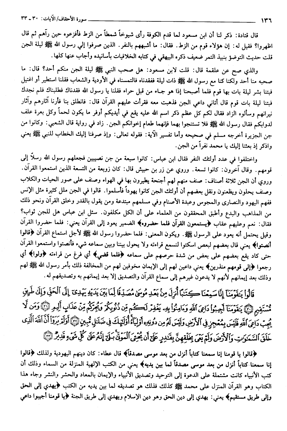 قالُوا يا قَوْمَنا إِنَّا سَمِعْنا كِتاباً أُنْزِلَ مِنْ بَعْدِ مُوسى مُصَدِّقاً لِما بَيْنَ يَدَيْهِ يَهْدِي إِلَى الْحَقِّ وَإِلى طَرِيقٍ مُسْتَقِيمٍ (30) يا قَوْمَنا أَجِيبُوا داعِيَ اللَّهِ وَآمِنُوا بِهِ يَغْفِرْ لَكُمْ مِنْ ذُنُوبِكُمْ وَيُجِرْكُمْ مِنْ عَذابٍ أَلِيمٍ (31) وَمَنْ لا يُجِبْ داعِيَ اللَّهِ فَلَيْسَ بِمُعْجِزٍ فِي الْأَرْضِ وَلَيْسَ لَهُ مِنْ دُونِهِ أَوْلِياءُ أُولئِكَ فِي ضَلالٍ مُبِينٍ (32) أَوَلَمْ يَرَوْا أَنَّ اللَّهَ الَّذِي خَلَقَ السَّماواتِ وَالْأَرْضَ وَلَمْ يَعْيَ بِخَلْقِهِنَّ بِقادِرٍ عَلى أَنْ يُحْيِيَ الْمَوْتى بَلى إِنَّهُ عَلى كُلِّ شَيْءٍ قَدِيرٌ (33)