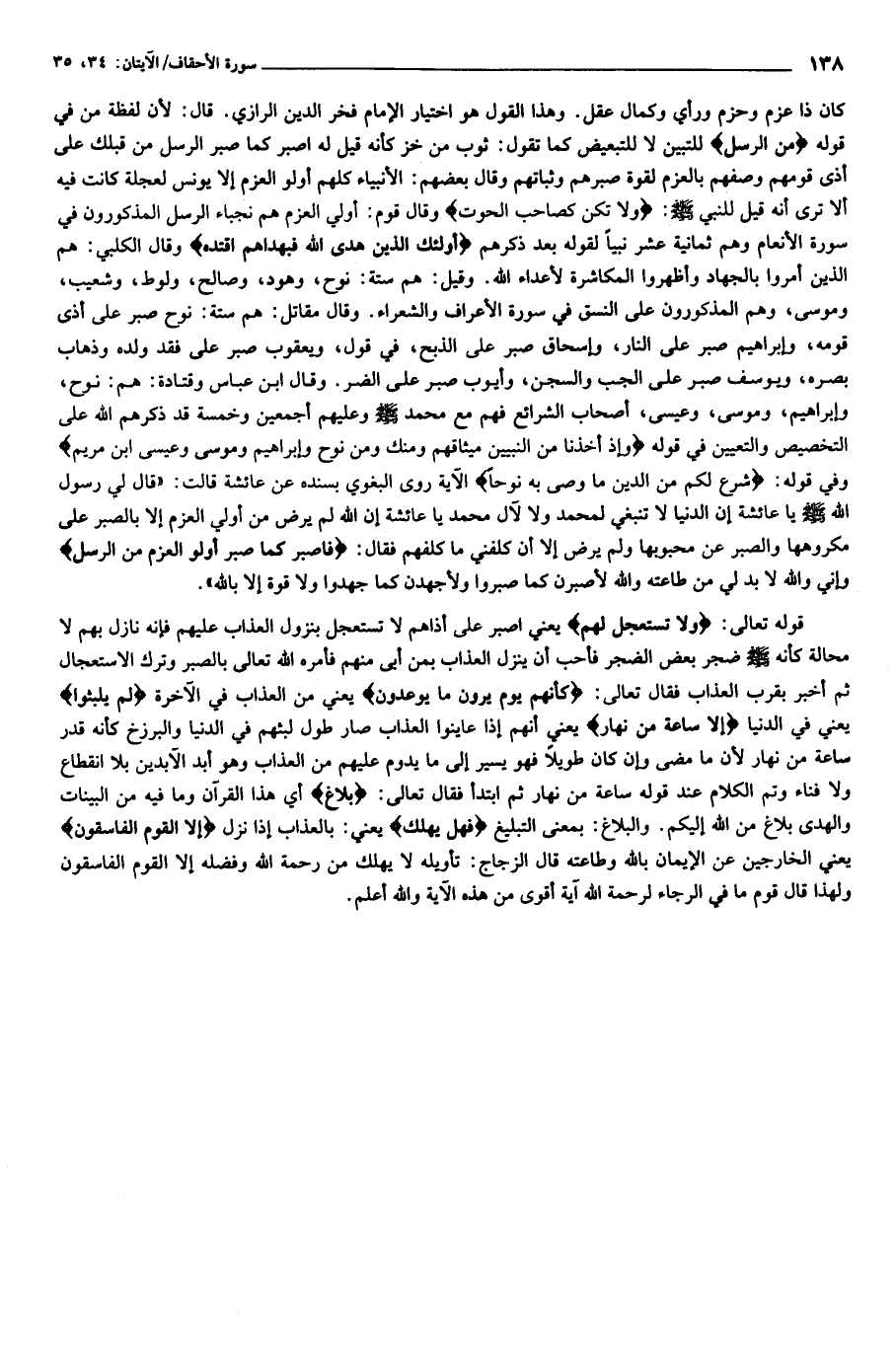 كان ذا عزم وحزم ورأي وكمال عقل. وهذا القول هو اختيار الإمام فخر الدين الرازي. قال: لأن لفظة من في قوله مِنَ الرُّسُلِ للتبين لا للتبعيض كما تقول: ثوب من خز كأنه قيل له اصبر كما صبر الرسل من قبلك على أذى قومهم وصفهم بالعزم لقوة صبرهم وثباتهم وقال بعضهم: الأنبياء كلهم أولو العزم إلا يونس لعجلة كانت فيه ألا ترى أنه قيل للنبي صلّى الله عليه وسلّم: وَلا تَكُنْ كَصاحِبِ الْحُوتِ وقال قوم: أولي العزم هم نجباء الرسل المذكورون في سورة الأنعام وهم ثمانية عشر نبيا لقوله بعد ذكرهم أُولئِكَ الَّذِينَ هَدَى اللَّهُ فَبِهُداهُمُ اقْتَدِهْ وقال الكلبي: هم الذين أمروا بالجهاد وأظهروا المكاشرة لأعداء الله. وقيل: هم ستة: نوح، وهود، وصالح، ولوط، وشعيب، وموسى، وهم المذكورون على النسق في سورة الأعراف والشعراء. وقال مقاتل: هم ستة: نوح صبر على أذى قومه، وإبراهيم صبر على النار، وإسحاق صبر على الذبح، في قول، ويعقوب صبر على فقد ولده وذهاب بصره، ويوسف صبر على الجب والسجن، وأيوب صبر على الضر. وقال ابن عباس وقتادة: هم: نوح، وإبراهيم، وموسى، وعيسى، أصحاب الشرائع فهم مع محمد صلّى الله عليه وسلّم وعليهم أجمعين وخمسة قد ذكرهم الله على التخصيص والتعيين في قوله وَإِذْ أَخَذْنا مِنَ النَّبِيِّينَ مِيثاقَهُمْ وَمِنْكَ وَمِنْ نُوحٍ وَإِبْراهِيمَ وَمُوسى وَعِيسَى ابْنِ مَرْيَمَ وفي قوله: شَرَعَ لَكُمْ مِنَ الدِّينِ ما وَصَّى بِهِ نُوحاً الآية روى البغوي بسنده عن عائشة قالت: «قال لي رسول الله صلّى الله عليه وسلّم يا عائشة إن الدنيا لا تنبغي لمحمد ولا لآل محمد يا عائشة إن الله لم يرض من أولي العزم إلا بالصبر على مكروهها والصبر عن محبوبها ولم يرض إلا أن كلفني ما كلفهم فقال: فَاصْبِرْ كَما صَبَرَ أُولُوا الْعَزْمِ مِنَ الرُّسُلِ وإني والله لا بد لي من طاعته والله لأصبرن كما صبروا ولأجهدن كما جهدوا ولا قوة إلا بالله».