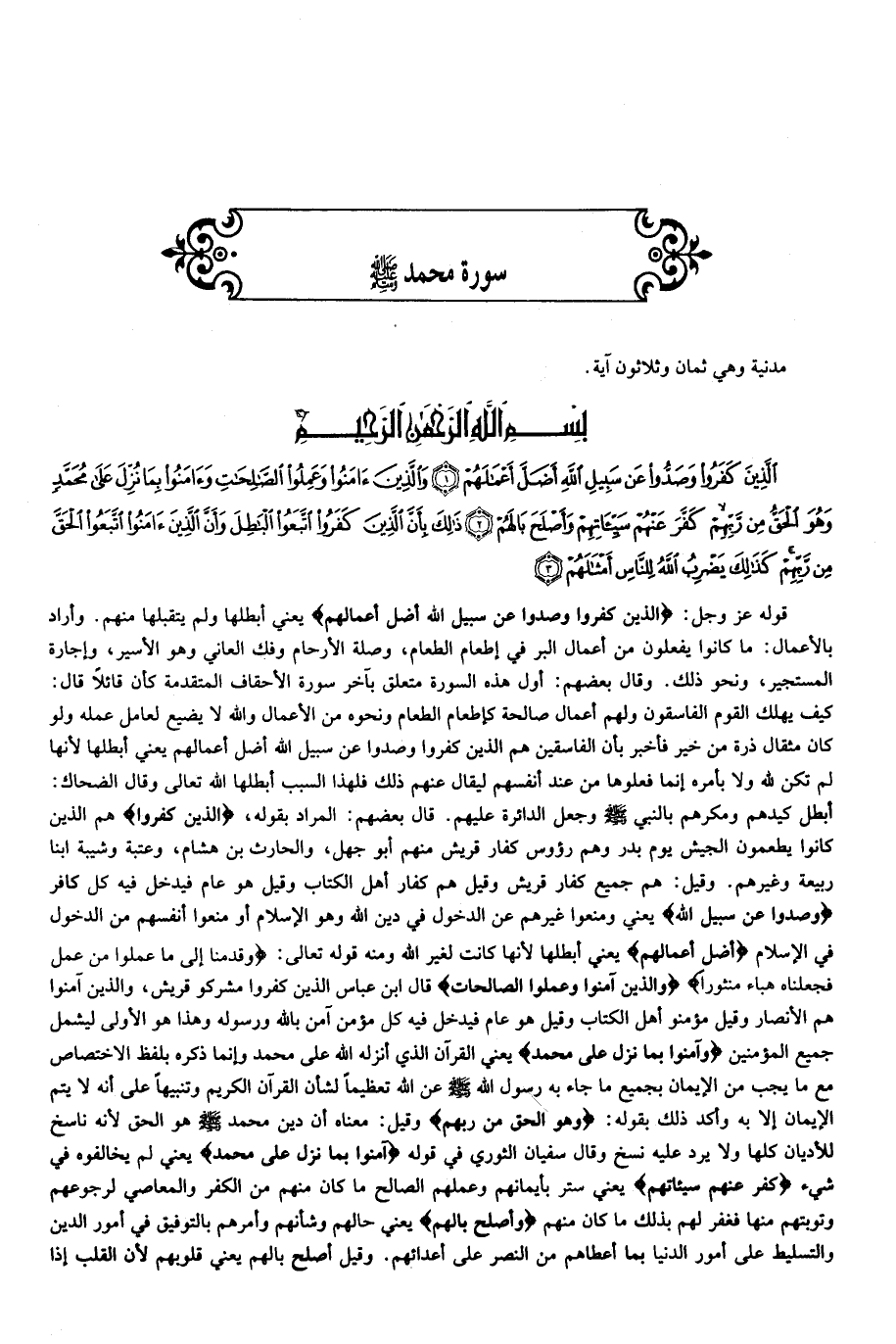 الَّذِينَ كَفَرُوا وَصَدُّوا عَنْ سَبِيلِ اللَّهِ أَضَلَّ أَعْمالَهُمْ (1) وَالَّذِينَ آمَنُوا وَعَمِلُوا الصَّالِحاتِ وَآمَنُوا بِما نُزِّلَ عَلى مُحَمَّدٍ وَهُوَ الْحَقُّ مِنْ رَبِّهِمْ كَفَّرَ عَنْهُمْ سَيِّئاتِهِمْ وَأَصْلَحَ بالَهُمْ (2) ذلِكَ بِأَنَّ الَّذِينَ كَفَرُوا اتَّبَعُوا الْباطِلَ وَأَنَّ الَّذِينَ آمَنُوا اتَّبَعُوا الْحَقَّ مِنْ رَبِّهِمْ كَذلِكَ يَضْرِبُ اللَّهُ لِلنَّاسِ أَمْثالَهُمْ (3)