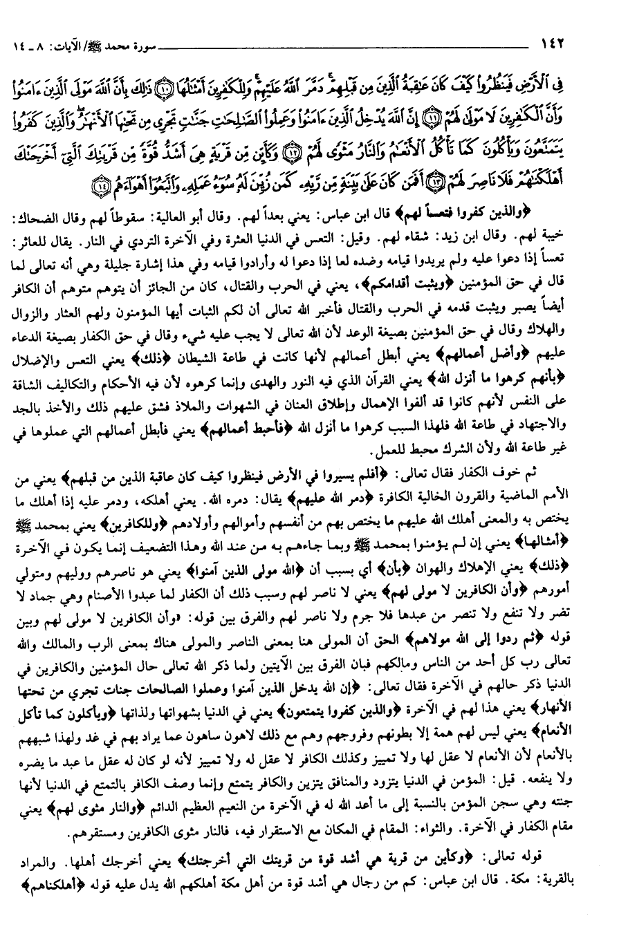 ثم خوف الكفار فقال تعالى: أَفَلَمْ يَسِيرُوا فِي الْأَرْضِ فَيَنْظُرُوا كَيْفَ كانَ عاقِبَةُ الَّذِينَ مِنْ قَبْلِهِمْ يعني من الأمم الماضية والقرون الخالية الكافرة دَمَّرَ اللَّهُ عَلَيْهِمْ يقال: دمره الله. يعني أهلكه، ودمر عليه إذا أهلك ما يختص به والمعنى أهلك الله عليهم ما يختص بهم من أنفسهم وأموالهم وأولادهم وَلِلْكافِرِينَ يعني بمحمد صلّى الله عليه وسلّم أَمْثالُها يعني إن لم يؤمنوا بمحمد صلّى الله عليه وسلّم وبما جاءهم به من عند الله وهذا التضعيف إنما يكون في الآخرة ذلِكَ يعني الإهلاك والهوان بِأَنَّ أي بسبب أن اللَّهَ مَوْلَى الَّذِينَ آمَنُوا يعني هو ناصرهم ووليهم ومتولي أمورهم وَأَنَّ الْكافِرِينَ لا مَوْلى لَهُمْ يعني لا ناصر لهم وسبب ذلك أن الكفار لما عبدوا الأصنام وهي جماد لا تضر ولا تنفع ولا تنصر من عبدها فلا جرم ولا ناصر لهم والفرق بين قوله: «وأن الكافرين لا مولى لهم وبين قوله ثُمَّ رُدُّوا إِلَى اللَّهِ مَوْلاهُمُ الحق أن المولى هنا بمعنى الناصر والمولى هناك بمعنى الرب والمالك والله تعالى رب كل أحد من الناس ومالكهم فبان الفرق بين الآيتين ولما ذكر الله تعالى حال المؤمنين والكافرين في الدنيا ذكر حالهم في الآخرة فقال تعالى: إِنَّ اللَّهَ يُدْخِلُ الَّذِينَ آمَنُوا وَعَمِلُوا الصَّالِحاتِ جَنَّاتٍ تَجْرِي مِنْ تَحْتِهَا الْأَنْهارُ يعني هذا لهم في الآخرة وَالَّذِينَ كَفَرُوا يَتَمَتَّعُونَ يعني في الدنيا بشهواتها ولذاتها وَيَأْكُلُونَ كَما تَأْكُلُ الْأَنْعامُ يعني ليس لهم همة إلا بطونهم وفروجهم وهم مع ذلك لاهون ساهون عما يراد بهم في غد ولهذا شبههم بالأنعام لأن الأنعام لا عقل لها ولا تمييز وكذلك الكافر لا عقل له ولا تمييز لأنه لو كان له عقل ما عبد ما يضره ولا ينفعه. قيل: المؤمن في الدنيا يتزود والمنافق يتزين والكافر يتمتع وإنما وصف الكافر بالتمتع في الدنيا لأنها جنته وهي سجن المؤمن بالنسبة إلى ما أعد الله له في الآخرة من النعيم العظيم الدائم وَالنَّارُ مَثْوىً لَهُمْ يعني مقام الكفار في الآخرة. والثواء: المقام في المكان مع الاستقرار فيه، فالنار مثوى الكافرين ومستقرهم.