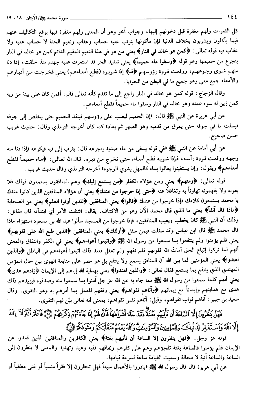 فَهَلْ يَنْظُرُونَ إِلاَّ السَّاعَةَ أَنْ تَأْتِيَهُمْ بَغْتَةً فَقَدْ جاءَ أَشْراطُها فَأَنَّى لَهُمْ إِذا جاءَتْهُمْ ذِكْراهُمْ (18) فَاعْلَمْ أَنَّهُ لا إِلهَ إِلاَّ اللَّهُ وَاسْتَغْفِرْ لِذَنْبِكَ وَلِلْمُؤْمِنِينَ وَالْمُؤْمِناتِ وَاللَّهُ يَعْلَمُ مُتَقَلَّبَكُمْ وَمَثْواكُمْ (19)