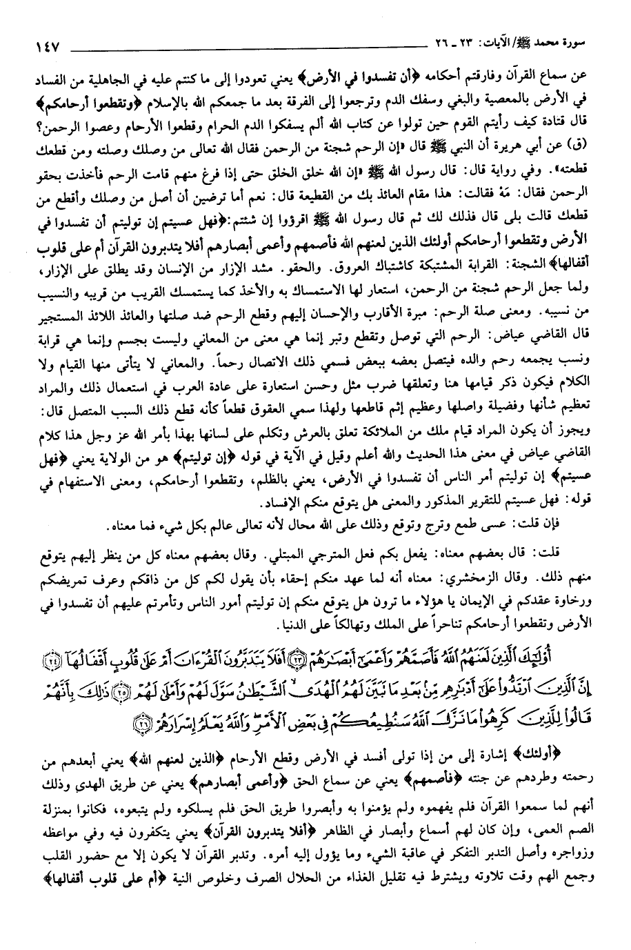 أُولئِكَ إشارة إلى من إذا تولى أفسد في الأرض وقطع الأرحام الَّذِينَ لَعَنَهُمُ اللَّهُ يعني أبعدهم من رحمته وطردهم عن جنته فَأَصَمَّهُمْ يعني عن سماع الحق وَأَعْمى أَبْصارَهُمْ يعني عن طريق الهدى وذلك أنهم لما سمعوا القرآن فلم يفهموه ولم يؤمنوا به وأبصروا طريق الحق فلم يسلكوه ولم يتبعوه، فكانوا بمنزلة الصم العمى، وإن كان لهم أسماع وأبصار في الظاهر أَفَلا يَتَدَبَّرُونَ الْقُرْآنَ يعني يتكفرون فيه وفي مواعظه وزواجره وأصل التدبر التفكر في عاقبة الشيء وما يؤول إليه أمره. وتدبر القرآن لا يكون إلا مع حضور القلب وجمع الهم وقت تلاوته ويشترط فيه تقليل الغذاء من الحلال الصرف وخلوص النية أَمْ عَلى قُلُوبٍ أَقْفالُها