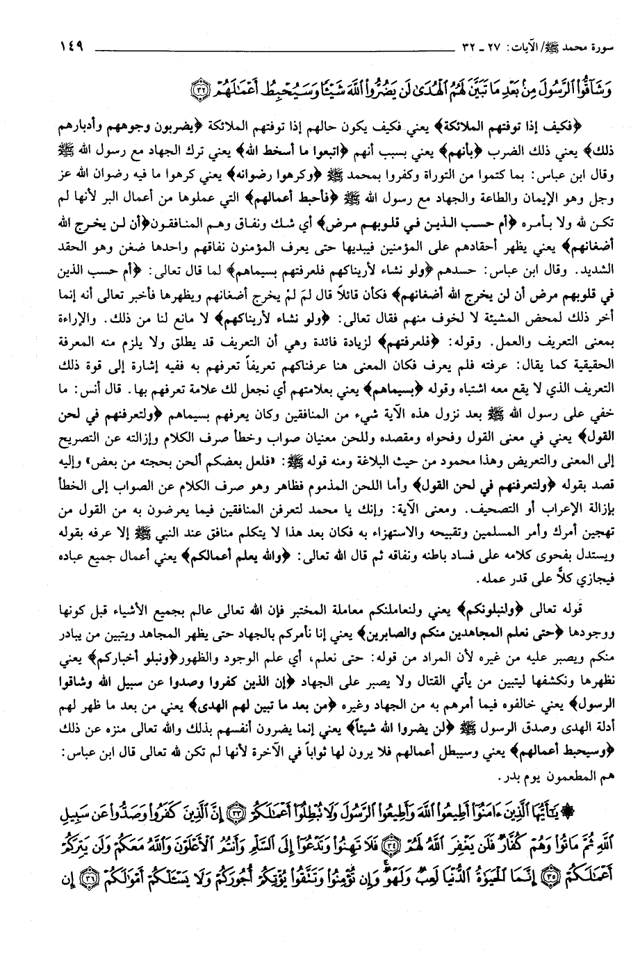 قوله تعالى وَلَنَبْلُوَنَّكُمْ يعني ولنعاملنكم معاملة المختبر فإن الله تعالى عالم بجميع الأشياء قبل كونها ووجودها حَتَّى نَعْلَمَ الْمُجاهِدِينَ مِنْكُمْ وَالصَّابِرِينَ يعني إنا نأمركم بالجهاد حتى يظهر المجاهد ويتبين من يبادر منكم ويصبر عليه من غيره لأن المراد من قوله: حتى نعلم، أي علم الوجود والظهور وَنَبْلُوَا أَخْبارَكُمْ يعني نظهرها ونكشفها ليتبين من يأتي القتال ولا يصبر على الجهاد إِنَّ الَّذِينَ كَفَرُوا وَصَدُّوا عَنْ سَبِيلِ اللَّهِ وَشَاقُّوا الرَّسُولَ يعني خالفوه فيما أمرهم به من الجهاد وغيره مِنْ بَعْدِ ما تَبَيَّنَ لَهُمُ الْهُدى يعني من بعد ما ظهر لهم أدلة الهدى وصدق الرسول صلّى الله عليه وسلّم لَنْ يَضُرُّوا اللَّهَ شَيْئاً يعني إنما يضرون أنفسهم بذلك والله تعالى منزه عن ذلك وَسَيُحْبِطُ أَعْمالَهُمْ يعني وسيبطل أعمالهم فلا يرون لها ثوابا في الآخرة لأنها لم تكن لله تعالى قال ابن عباس:
