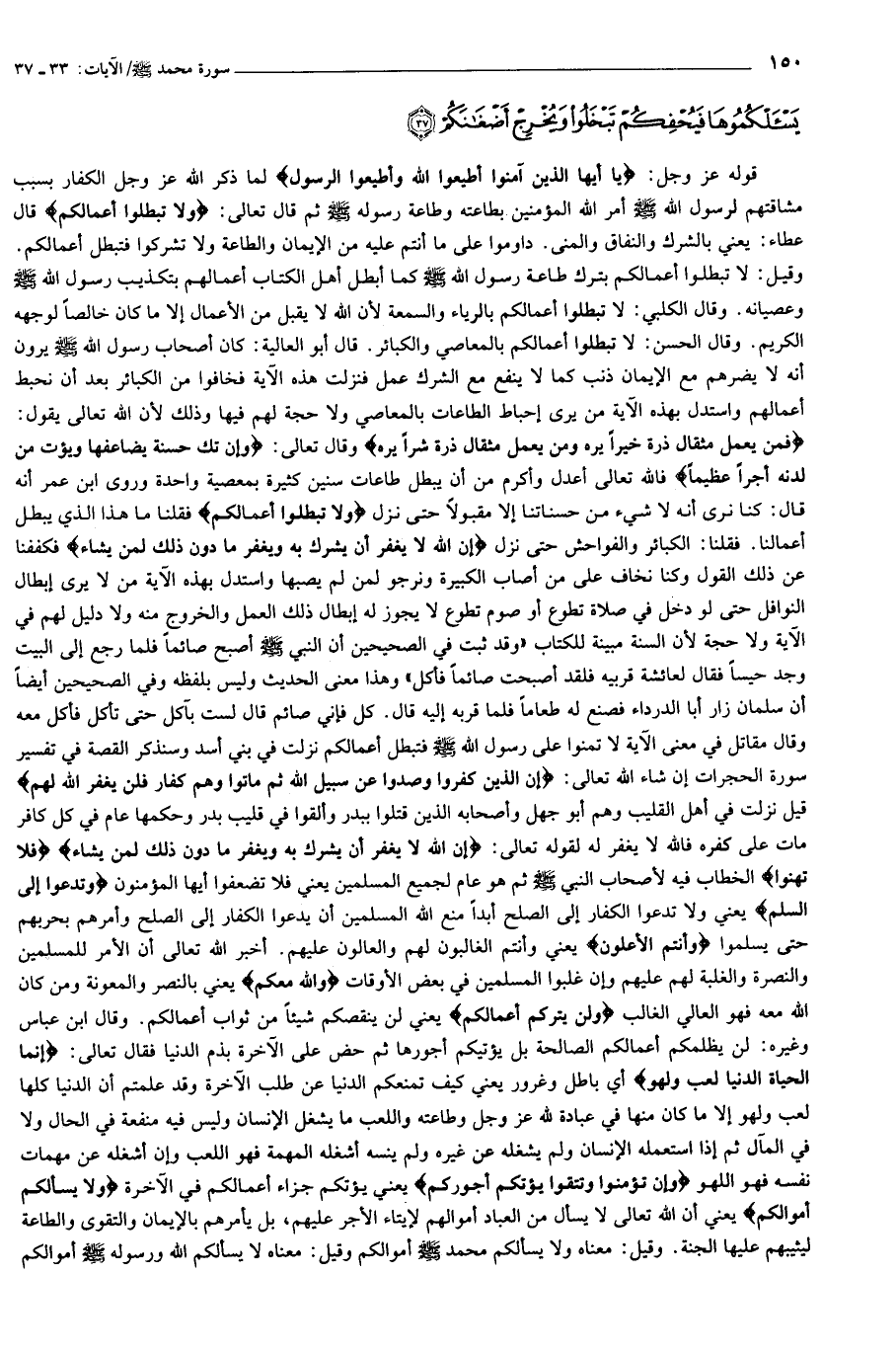 يا أَيُّهَا الَّذِينَ آمَنُوا أَطِيعُوا اللَّهَ وَأَطِيعُوا الرَّسُولَ وَلا تُبْطِلُوا أَعْمالَكُمْ (33) إِنَّ الَّذِينَ كَفَرُوا وَصَدُّوا عَنْ سَبِيلِ اللَّهِ ثُمَّ ماتُوا وَهُمْ كُفَّارٌ فَلَنْ يَغْفِرَ اللَّهُ لَهُمْ (34) فَلا تَهِنُوا وَتَدْعُوا إِلَى السَّلْمِ وَأَنْتُمُ الْأَعْلَوْنَ وَاللَّهُ مَعَكُمْ وَلَنْ يَتِرَكُمْ أَعْمالَكُمْ (35) إِنَّمَا الْحَياةُ الدُّنْيا لَعِبٌ وَلَهْوٌ وَإِنْ تُؤْمِنُوا وَتَتَّقُوا يُؤْتِكُمْ أُجُورَكُمْ وَلا يَسْئَلْكُمْ أَمْوالَكُمْ (36) إِنْ يَسْئَلْكُمُوها فَيُحْفِكُمْ تَبْخَلُوا وَيُخْرِجْ أَضْغانَكُمْ (37)