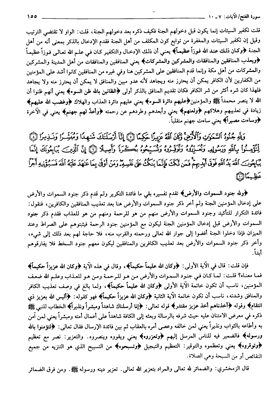 فإن قلت: قال في الآية الأولى: وَكانَ اللَّهُ عَلِيماً حَكِيماً، وقال في هذه الآية وَكانَ اللَّهُ عَزِيزاً حَكِيماً فما معناه؟ قلت: لما كان في جنود السموات والأرض من هو للرحمة ومن هو للعذاب وعلم الله ضعف المؤمنين، ناسب أن تكون خاتمة الآية الأولى وَكانَ اللَّهُ عَلِيماً حَكِيماً، ولما بالغ في وصف تعذيب الكافر والمنافق وشدته، ناسب أن تكون خاتمة الآية الثانية وَكانَ اللَّهُ عَزِيزاً حَكِيماً فهو كقوله: أَلَيْسَ اللَّهُ بِعَزِيزٍ ذِي انْتِقامٍ وقوله فَأَخَذْناهُمْ أَخْذَ عَزِيزٍ مُقْتَدِرٍ قوله تعالى: إِنَّا أَرْسَلْناكَ شاهِداً وَمُبَشِّراً وَنَذِيراً الخطاب للنبي صلّى الله عليه وسلّم ذكره في معرض الامتنان عليه حيث شرفه بالرسالة وبعثه إلى الكافة شاهدا على أعمال أمته ومبشرا يعني لمن آمن به وأطاعه بالثواب ونذيرا يعني لمن خالفه وعصى أمره بالعقاب ثم بين فائدة الإرسال فقال تعالى: لِتُؤْمِنُوا بِاللَّهِ وَرَسُولِهِ فالضمير فيه للناس المرسل إليهم وَتُعَزِّرُوهُ يعني ويقووه وينصروه. والتعزير: نصر مع تعظيم وَتُوَقِّرُوهُ يعني وتعظموه والتوقير: التعظيم والتبجيل وَتُسَبِّحُوهُ من التسبيح الذي هو التنزيه من جميع النقائص أو من السبحة وهي الصلاة.