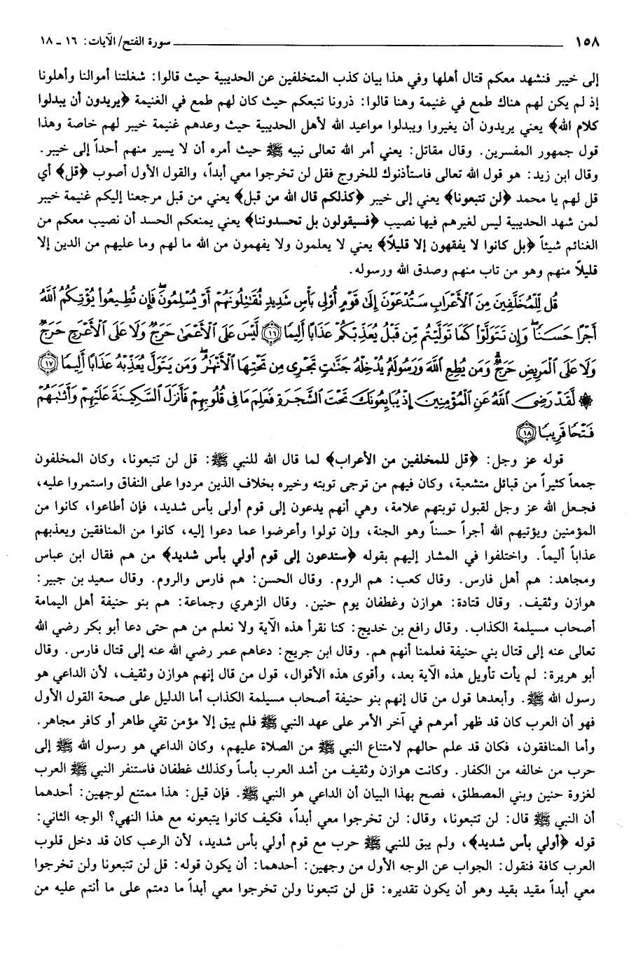 قُلْ لِلْمُخَلَّفِينَ مِنَ الْأَعْرابِ سَتُدْعَوْنَ إِلى قَوْمٍ أُولِي بَأْسٍ شَدِيدٍ تُقاتِلُونَهُمْ أَوْ يُسْلِمُونَ فَإِنْ تُطِيعُوا يُؤْتِكُمُ اللَّهُ أَجْراً حَسَناً وَإِنْ تَتَوَلَّوْا كَما تَوَلَّيْتُمْ مِنْ قَبْلُ يُعَذِّبْكُمْ عَذاباً أَلِيماً (16) لَيْسَ عَلَى الْأَعْمى حَرَجٌ وَلا عَلَى الْأَعْرَجِ حَرَجٌ وَلا عَلَى الْمَرِيضِ حَرَجٌ وَمَنْ يُطِعِ اللَّهَ وَرَسُولَهُ يُدْخِلْهُ جَنَّاتٍ تَجْرِي مِنْ تَحْتِهَا الْأَنْهارُ وَمَنْ يَتَوَلَّ يُعَذِّبْهُ عَذاباً أَلِيماً (17) لَقَدْ رَضِيَ اللَّهُ عَنِ الْمُؤْمِنِينَ إِذْ يُبايِعُونَكَ تَحْتَ الشَّجَرَةِ فَعَلِمَ ما فِي قُلُوبِهِمْ فَأَنْزَلَ السَّكِينَةَ عَلَيْهِمْ وَأَثابَهُمْ فَتْحاً قَرِيباً (18)
