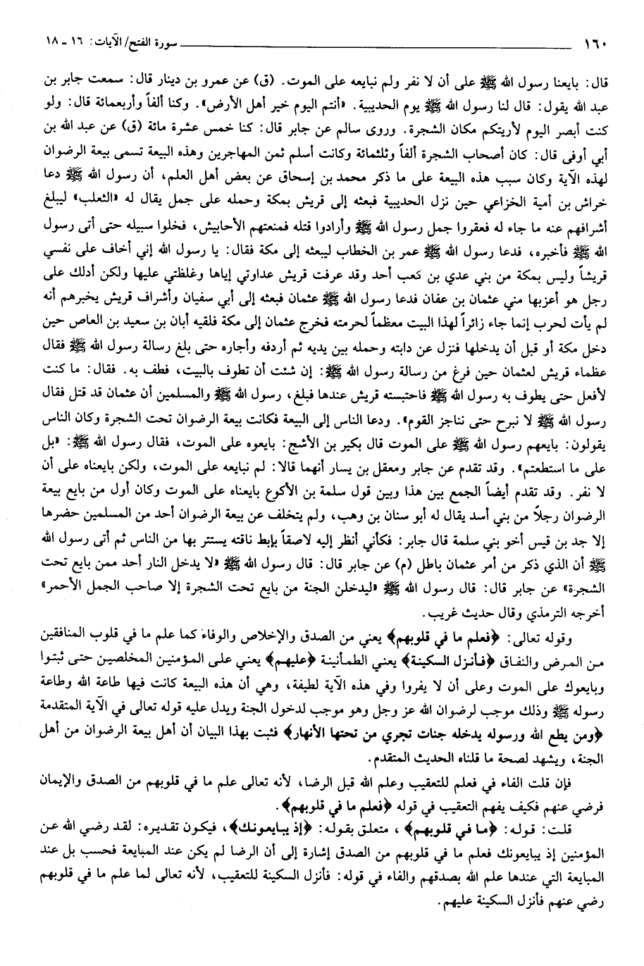 وقوله تعالى: فَعَلِمَ ما فِي قُلُوبِهِمْ يعني من الصدق والإخلاص والوفاء كما علم ما في قلوب المنافقين من المرض والنفاق فَأَنْزَلَ السَّكِينَةَ يعني الطمأنينة عَلَيْهِمْ يعني على المؤمنين المخلصين حتى ثبتوا وبايعوك على الموت وعلى أن لا يفروا وفي هذه الآية لطيفة، وهي أن هذه البيعة كانت فيها طاعة الله وطاعة رسوله صلّى الله عليه وسلّم وذلك موجب لرضوان الله عز وجل وهو موجب لدخول الجنة ويدل عليه قوله تعالى في الآية المتقدمة وَمَنْ يُطِعِ اللَّهَ وَرَسُولَهُ يُدْخِلْهُ جَنَّاتٍ تَجْرِي مِنْ تَحْتِهَا الْأَنْهارُ فثبت بهذا البيان أن أهل بيعة الرضوان من أهل الجنة، ويشهد لصحة ما قلناه الحديث المتقدم.